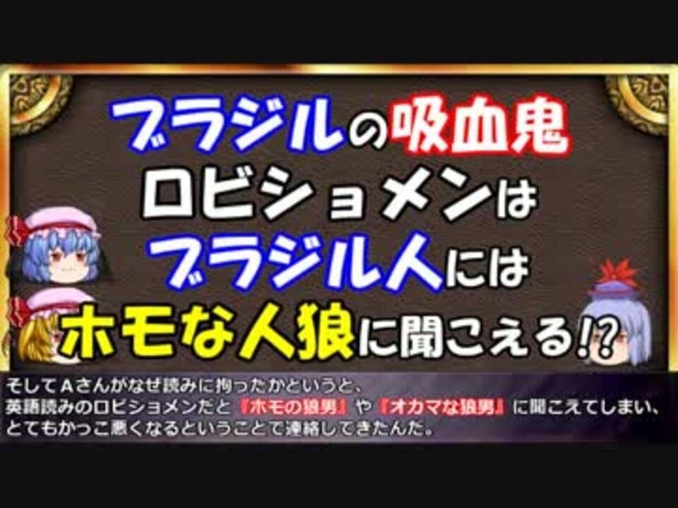 前編(<a href="https://www.nicovideo.jp/watch/sm28411781" class="watch">sm28411781</a>)と特に繋がりはありませんので、こちらから見て頂いても大丈夫です。<br> 後編は番外編2(<a href="https://www.nicovideo.jp/watch/sm27694863" class="watch">sm27694863</a>)で紹介した世界の吸血鬼に関して<br> もう少し突っ込んだ解説をしていきます。<br> 前半はブラジルの吸血鬼ジャララカスとロビショメン、<br> 後半は(<a href="#" class="seekTime" data-seekTime="14:52" onclick="seekNicoPlayer('#14:52'); return false;">#14:52</a>)マレーシアの吸血鬼ペナンガランやポンティアナ、<br> そして関連があるとされる飛頭蛮についても解説します。<br> <br> 今回情報提供頂いたひょうすべさんの動画はこちら→<a href="https://www.nicovideo.jp/watch/sm27133575" class="watch">sm27133575</a>(<a href="https://www.nicovideo.jp/mylist/48019049" target="_blank" rel="noopener">mylist/48019049</a>)<br> <br> 動画で紹介したガスーのCMはこちらです。<br> <a href="https://www.youtube.com/watch?v=8fgPTN0E6ys" target="_blank" rel="noopener nofollow">https://www.youtube.com/watch?v=8fgPTN0E6ys</a><br> <br>吸血鬼解説ブログもやっているので、ぜひご覧ください<br><a href="https://www.vampire-load-ruthven.com/" target="_blank" rel="noopener nofollow">https://www.vampire-load-ruthven.com/</a><br><br> ゆっくりと学ぶ吸血鬼シリーズ<br><a href="https://www.nicovideo.jp/series/7926" target="_blank" rel="noopener">series/7926</a><br> <a href="https://www.nicovideo.jp/mylist/52570817" target="_blank" rel="noopener">mylist/52570817</a><br> 前<a href="https://www.nicovideo.jp/watch/sm28411781" class="watch">sm28411781</a> 次<a href="https://www.nicovideo.jp/watch/sm28611810" class="watch">sm28611810</a><br> ご質問・情報提供等はコメント・メール・ツイッターまで<br>