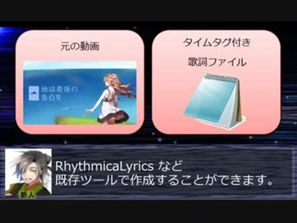 ▼ニコカラ(カラオケ字幕付き動画)作りが大変そうだったので、簡単にニコカラを作れるツールを自作しました。<br>▼素材をドラッグ&ドロップしてニコカラを作れます。<br>▼前回からの改良点もご報告します。<br>▼ナレーションは UTAU 音源です:惡音キン★、折人★、君影ちはな★、句音コノ。★、玲縹★、槌音ずも★、遠音チア★、芽々田蛙声★、ワタクシ★(★印はうp時点での唄詠使用支援中音源)<br>▼ニコカラメーカー 3 公式サイト……<a href="https://shinta.coresv.com/software/nicokaramaker3-jpn/" target="_blank" rel="noopener nofollow">https://shinta.coresv.com/software/nicokaramaker3-jpn/</a><br>▼ブログ版の作り方……<a href="https://shinta0806be.ldblog.jp/archives/9544780.html" target="_blank" rel="noopener nofollow">https://shinta0806be.ldblog.jp/archives/9544780.html</a><br>▼ニコカラメーカーで作られた動画たち……<a href="https://commons.nicovideo.jp/works/sm28311188/tree/children" target="_blank" rel="noopener nofollow">https://commons.nicovideo.jp/works/sm28311188/tree/children</a><br>▼ナレーション発声には、UTAU 自動トークツール「唄詠」(うたよみ)を使用しています。<br>▼前回:<a href="https://www.nicovideo.jp/watch/sm28276193" class="watch">sm28276193</a>←→次回:<a href="https://www.nicovideo.jp/watch/sm28698106" class="watch">sm28698106</a><br /><br>◇ SHINTA ◇<br>▼作品リスト:<a href="https://www.nicovideo.jp/mylist/8819451" target="_blank" rel="noopener">mylist/8819451</a><br>▼クリエイターサポートお待ちしております→<a href="https://creator-support.nicovideo.jp/registration/9520206" target="_blank" rel="noopener nofollow">https://creator-support.nicovideo.jp/registration/9520206</a><br>▼pixivFANBOX へのご入会お待ちしております→<a href="https://shinta0806.fanbox.cc/" target="_blank" rel="noopener nofollow">https://shinta0806.fanbox.cc/</a>