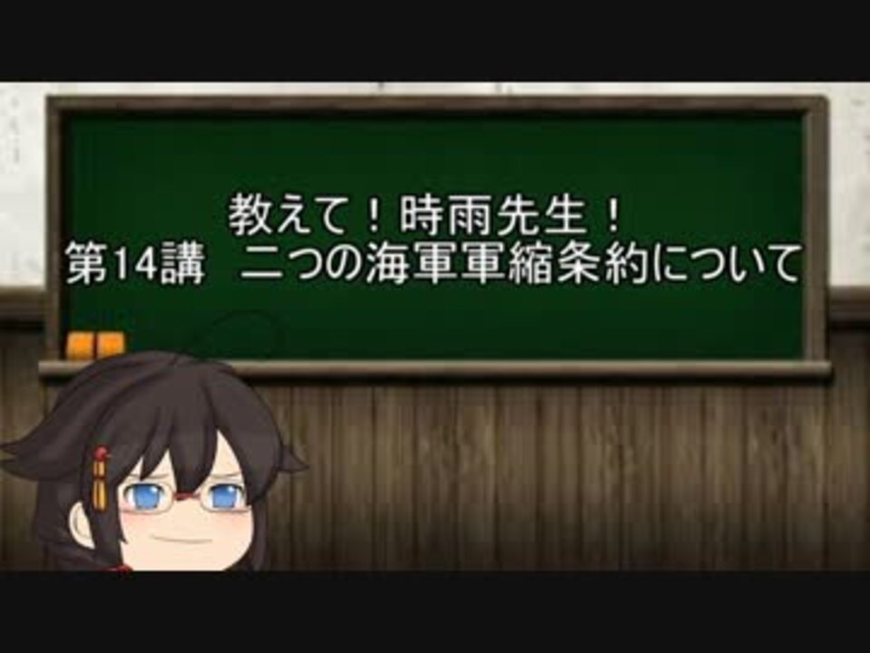 時雨「今回は予定を変えて海軍軍縮条約の話だよ」<br />ワイ「このタイミングで条約の話って授業の進め方ガバガバすぎへん?」<br />時雨「ガバガバなのは君の動画編成でしょ?」<br /><br />【<a href="https://www.nicovideo.jp/watch/sm28338054" class="watch">sm28338054</a>】前 次【<a href="https://www.nicovideo.jp/watch/sm29822355" class="watch">sm29822355</a>】<br />マイリスト【<a href="https://www.nicovideo.jp/mylist/51016350" target="_blank" rel="noopener">mylist/51016350</a>】<br />要望、苦情、支援イラスト等はこちらまで→【メール】uho_e_tya_shu_men_334@yahoo.co.jp<br />【Twitter】@tyashumenn<br />ブロマガ→<a href="http://ch.nicovideo.jp/uho_e_tya_shu_men_334" target="_blank" rel="noopener nofollow">http://ch.nicovideo.jp/uho_e_tya_shu_men_334</a>