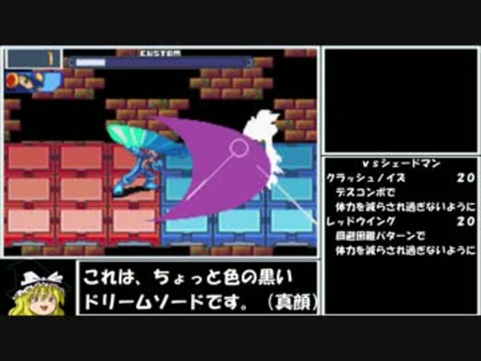 第10話 「闇の誘惑」 縛り違反?それは違います。これは、ちょっと色の黒いドリームソードです。<br />これ以降はトーナメント優勝までサクサク進めたので、次の投稿は4週間後でなく3週間後になってます。<br />今回の主な制限も、ストーリーをP・Aだけでクリアするというものです。詳細はマイリストにあります。<br /><br />ロックマン3 <a href="https://www.nicovideo.jp/mylist/24611106" target="_blank" rel="noopener">mylist/24611106</a><br />ロックマン4 <a href="https://www.nicovideo.jp/mylist/35326464" target="_blank" rel="noopener">mylist/35326464</a><br />ロックマンエグゼ2 <a href="https://www.nicovideo.jp/mylist/27911831" target="_blank" rel="noopener">mylist/27911831</a><br />ロックマンエグゼ3 <a href="https://www.nicovideo.jp/mylist/39372889" target="_blank" rel="noopener">mylist/39372889</a><br />ロックマンエグゼ4 <a href="https://www.nicovideo.jp/mylist/53800848" target="_blank" rel="noopener">mylist/53800848</a><br />スプラトゥーン <a href="https://www.nicovideo.jp/mylist/54759370" target="_blank" rel="noopener">mylist/54759370</a><br /><br />第9話 <a href="https://www.nicovideo.jp/watch/sm28349443" class="watch">sm28349443</a> 第11話 <a href="https://www.nicovideo.jp/watch/sm28580711" class="watch">sm28580711</a><br /><br />ついったー <a href="https://twitter.com/J_NEX_PA" target="_blank" rel="noopener nofollow">https://twitter.com/J_NEX_PA</a>