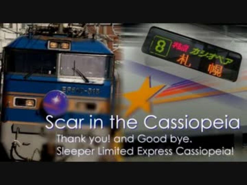 <font size="6">さようなら、また会う日まで</font><br /><b>―闇夜を駆け抜け、海を渡り、夢を運んだ寝台特急カシオペア。</b><br /> <b>明日新たに開業する北海道新幹線にバトンを託し、</b><br /> <b>3月21日に17年の歴史に幕を閉じました。</b><br /><br />今回私のカシオペアへの思いを形にしてみました。<br />幼いころから寝台特急に憧れを抱き、ようやく乗れたあの夏の思い出は忘れません<br /><br /><font size="2">【ヒロシゲ36号】寝台特急カシオペア8009レ(<a href="https://www.nicovideo.jp/watch/sm27376519" class="watch">sm27376519</a>)のリベンジでもあります。</font><br /><font size="1"><s>もう枠ズレなんて起こしてないはずだ</s></font><br />サムネ右側の画像を横浜快速様(@Yokohama_H021)よりお借りいたしました。この場を借りてお礼申し上げます。<br />リスペクトさせていただきました(<a href="https://www.nicovideo.jp/watch/sm23086249" class="watch">sm23086249</a>)<br />マイリスト <a href="https://www.nicovideo.jp/mylist/43472354" target="_blank" rel="noopener">mylist/43472354</a>
