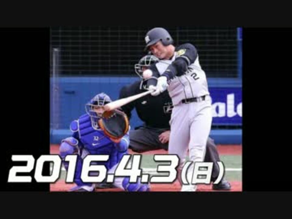 4月1日~3日のホームランまとめ → <a href="https://www.nicovideo.jp/watch/sm28565833" class="watch">sm28565833</a><br />[ 日本ハム ] レアード 1号(6回裏3ラン)<br />[ 阪神 ] ゴメス 4号(1回表2ラン) 、北條 1号(7回表ソロ) 、江越 1号(9回表2ラン)<br />[ 巨人 ] ギャレット 4号(2回表ソロ) 、坂本 1号(4回表2ラン)<br />[ 中日 ] 桂 1号(7回表2ラン)<br /><br /><b>火曜日の中継</b><br />巨×神(東京D 日テレG+ 1745~、BS日テレ 1800~)<br />中×横(ナゴヤ Jスポ2 1755~)<br />広×ヤ(マツダ Jスポ1 1755~)<br />西×日(西武 フジTWO 1750~、NHKBS1 1800~、テレ玉 1800~)<br />オ×楽(京セラ Jスポ3 1700~)<br />ソ×ロ(福岡 FOXスポ 1745~、東京MX 1930~)<br /><br /><a href="https://www.nicovideo.jp/mylist/54968202" target="_blank" rel="noopener">mylist/54968202</a>