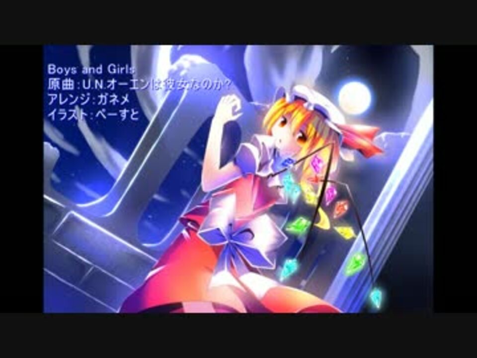 こんばんは、ガネメです^ω^<br />今回は大好きなフランちゃんの曲をユーロビート風にアレンジしてみました♪<br /><br />【お知らせ】<br />5月8日(日)に東京ビッグサイトで開催される第13回博麗神社例大祭に参加します。<br />スペースは【O-15a】になります^ω^<br />新譜持って行きますので遊びに来てください♪<br /><br />【原曲】U.N.オーエンは彼女なのか?<br />【アレンジ】ガネメ<br /> ・ツイッター:@ganemes<br /> ・マイリス:<a href="https://www.nicovideo.jp/mylist/35754242" target="_blank" rel="noopener">mylist/35754242</a><br /> ・コミュ:co2097025<br />【イラスト】ぺーすとさん<br /> ・ツイッター:@paste_yakusou<br /> ・pixiv:<a href="http://www.pixiv.net/member.php?id=744718" target="_blank" rel="noopener nofollow">http://www.pixiv.net/member.php?id=744718</a><br /><br />mp3→<a href="https://commons.nicovideo.jp/works/nc130972" target="_blank" rel="noopener">nc130972</a>/<a href="https://commons.nicovideo.jp/works/nc130973" target="_blank" rel="noopener">nc130973</a><br /><br />前作 妖夢ちゃん <a href="https://www.nicovideo.jp/watch/sm28286689" class="watch">sm28286689</a><br /><br />【追記】ぬこジタンさん・ぺけぺけさん・nukiさん・そらさん・みっちゃんさん宣伝ありがとうございます!!