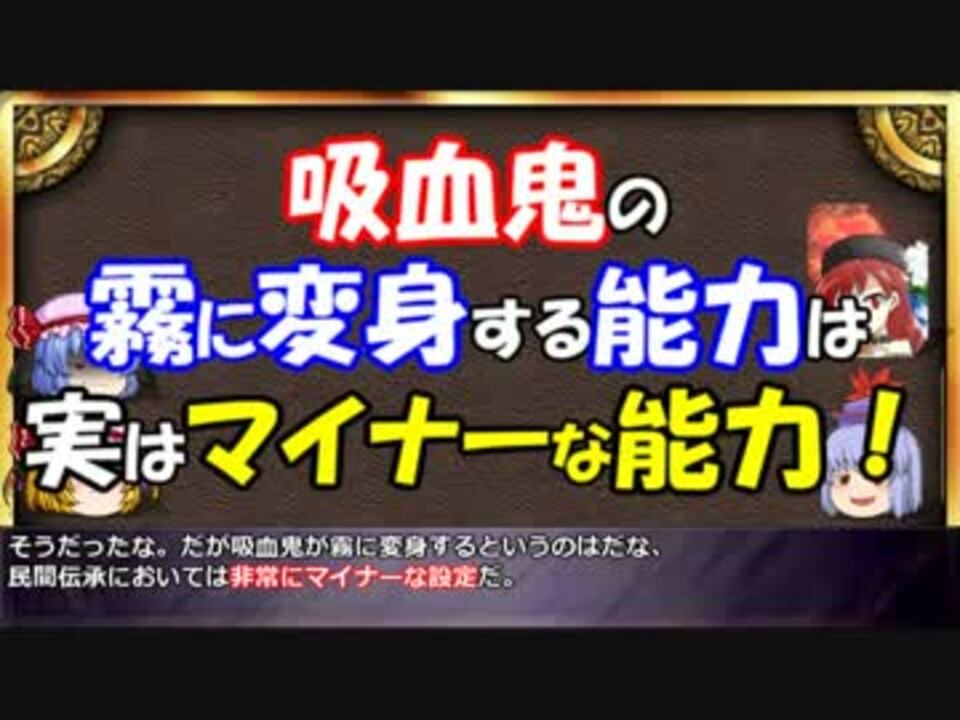 吸血鬼の弱点はネット上で日々様々な考察が繰り広げられていますが<br> その殆どが創作の吸血鬼の設定が混じったものです。<br> 吸血鬼の弱点は<span style="font-size: 18px;"><strong>民間信仰、キリスト教、ギリシャ神話</strong></span>などの思想が複雑に絡んでいます。<br> ですが独自解釈をされることも多く、その起源はあまり知られていないように思われます。<br> そこで今回は民間伝承の吸血鬼の能力と弱点をまとめて解説します。<br> <br> 前回(番外編3)もそうでしたが、今回は<strong>とあるキャラの元ネタ解説</strong>を兼ねているので<br> 東方カテゴリでの投稿です。<br> <br> ゆっくりと学ぶ吸血鬼シリーズ<br><a href="https://www.nicovideo.jp/series/7926" target="_blank" rel="noopener">series/7926</a><br> <a href="https://www.nicovideo.jp/mylist/52570817" target="_blank" rel="noopener">mylist/52570817</a><br> 番外編3sm28411781<br> 前<a href="https://www.nicovideo.jp/watch/sm28175581" class="watch">sm28175581</a> 中編<a href="https://www.nicovideo.jp/watch/sm28613421" class="watch">sm28613421</a><br>4/16追記:広告ありがとうございます