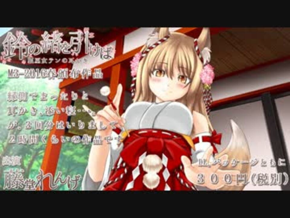 とみみです<br />音楽系の同人イベントM3-2016春にサークル参加します!<br />「第一展示場 L02b とみみ庵」にてパッケージ版を頒布します<br />イベントに先行してDL版の販売はこちら↓でしております!<br /><br /><a href="http://www.dlsite.com/home/work/=/product_id/RJ173774.html" target="_blank" rel="noopener nofollow">http://www.dlsite.com/home/work/=/product_id/RJ173774.html</a><br /><br />本作は日を改めながら耳かきをしてもらう音声作品として製作しました。<br />導入、耳かき、添い寝が三回分の内容となります。<br />日によって道具や動き、天気の違う耳かきをお楽しみいただけます。<br /><br />声:藤堂れんげ様 <a href="http://renge.michikusa.jp/" target="_blank" rel="noopener nofollow">http://renge.michikusa.jp/</a><br /><br />衣装協力 天水様 <a href="http://10th.kinugoshi.net/" target="_blank" rel="noopener nofollow">http://10th.kinugoshi.net/</a><br /><br />他(企画台本、イラスト、音響等)とみみ <br />※イラストの背景には一部フリー素材をお借りしています