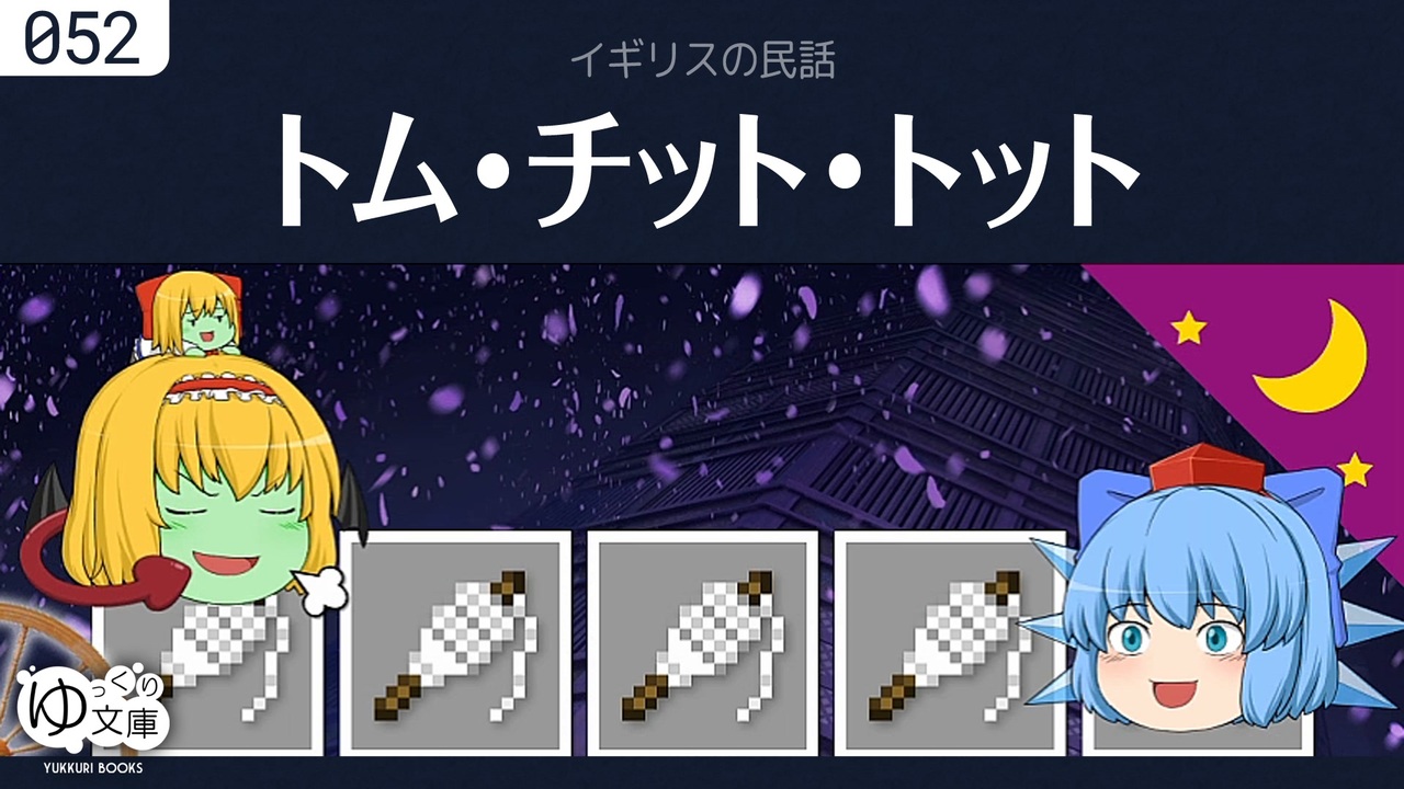 <span style="color: red;"><strong>052 ちぐはぐな童話──</strong></span><br>なんの取り柄もない娘が、ひょんなことからお妃様に。娘は結婚の条件を軽く考えていました。<br><span style="color: green;">Tom Tit Tot (1890) by Joseph Jacobs</span><br><br>(うp主より)かる~い童話を1つ。あまり深く考えないでね。たまにはこんな動画もいいでしょ?<br>編集後記:<a href="http://trynext.com/story/ybook/yb052.php" target="_blank" rel="noopener nofollow">http://trynext.com/story/ybook/yb052.php</a><br><br>●童話・民話<br><a href="https://www.nicovideo.jp/watch/sm22350451" class="watch">sm22350451</a> アンデルセン「人魚姫」<br><a href="https://www.nicovideo.jp/watch/sm25012338" class="watch">sm25012338</a> 馬場文耕「番町皿屋敷」<br><a href="https://www.nicovideo.jp/watch/sm28664187" class="watch">sm28664187</a> <span style="color: #ff00ff;"><strong>イギリスの民話「トム・チット・トット」</strong></span><br><a href="https://www.nicovideo.jp/watch/sm29349714" class="watch">sm29349714</a> フランスの民話「美女と野獣」<br><a href="https://www.nicovideo.jp/watch/sm31136727" class="watch">sm31136727</a> 特別編「グリム童話を語ろう」<br><a href="https://www.nicovideo.jp/watch/sm31137092" class="watch">sm31137092</a> グリム童話「ヘンゼルとグレーテル」<br><a href="https://www.nicovideo.jp/watch/sm31850121" class="watch">sm31850121</a> 特別編「グリム兄弟の足あと」<br><a href="https://www.nicovideo.jp/watch/sm36108362" class="watch">sm36108362</a> 日本の民話「キジも鳴かずば」<br><a href="https://www.nicovideo.jp/watch/sm36390093" class="watch">sm36390093</a> 日本の民話「瓜子姫と天邪鬼」<br><a href="https://www.nicovideo.jp/watch/sm36573468" class="watch">sm36573468</a> 日本の民話「火ともし山」<br><a href="https://www.nicovideo.jp/watch/sm37166712" class="watch">sm37166712</a> 日本の民話「茸の化け」<br><a href="https://www.nicovideo.jp/watch/sm37917102" class="watch">sm37917102</a> 日本の民話「猫岳の猫」<br><a href="https://www.nicovideo.jp/watch/sm40813612" class="watch">sm40813612</a> レアンダー「魔法の指輪」<br><a href="https://www.nicovideo.jp/watch/sm40813750" class="watch">sm40813750</a> 日本の民話「三合ばば」<br><a href="https://www.nicovideo.jp/watch/sm41028945" class="watch">sm41028945</a> アーヴィング「リップ・ヴァン・ウィンクル」<br><br>---<br>ゆっくり文庫:全部<br><a href="https://www.nicovideo.jp/mylist/74874627" target="_blank" rel="noopener">mylist/74874627</a><br>ゆっくり文庫:近況<br><a href="https://twitter.com/trynext" target="_blank" rel="noopener nofollow">https://twitter.com/trynext</a><br>---<br><br><br>