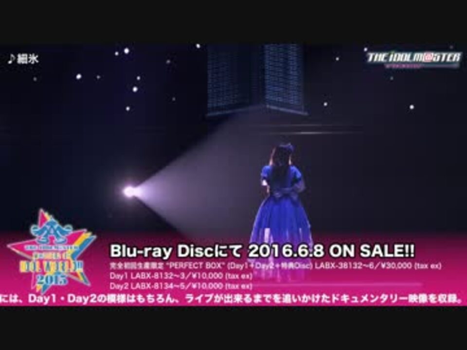 転載元:THE IDOLM@STER M@STERS OF IDOL WORLD!!2015 Live Blu-ray ダイジェスト映像【第3弾】<br /> <a href="https://www.youtube.com/watch?v=0Ur2YWkHWME" target="_blank" rel="noopener nofollow">https://www.youtube.com/watch?v=0Ur2YWkHWME</a><br />公式サイト:<a href="http://www.lantis.jp/imas/10th/" target="_blank" rel="noopener nofollow">http://www.lantis.jp/imas/10th/</a><br /><br />Youtubeの1080p版が美しすぎて販促効果がヤバイので転載します。<br />編集で1曲毎に区切ったため、元動画よりわずかに劣化しています。<br />本当の高画質は公式でどうぞ。<br />第3弾リスト:<a href="https://www.nicovideo.jp/mylist/55709428" target="_blank" rel="noopener">mylist/55709428</a><br />10thセトリ順リスト:<a href="https://www.nicovideo.jp/mylist/55537486" target="_blank" rel="noopener">mylist/55537486</a><br />前:First Step <a href="https://www.nicovideo.jp/watch/sm28761986" class="watch">sm28761986</a> 次:LOST <a href="https://www.nicovideo.jp/watch/sm28762312" class="watch">sm28762312</a><br /><br />追記:2016-05-04デイリーランキング<font color="blue" size=5>72</font>位ありがとうございます。
