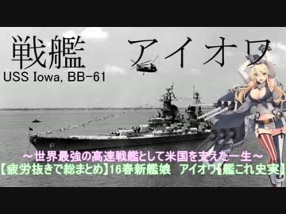 「アイオワ」は世界最強の高速戦艦として米国を支え<br />空母戦に移った後でも新たな戦艦の活躍の機会を見出しました<br />その史実をわかりやすく紹介します<br /><br />スピード感とわかりやすさを重視したため細かい事実や人物名などは省略させていただいています<br /><br />ゆっくりボイス・新グラバレご注意<br /><br />こちらもどうぞ<br />【疲労抜きで総まとめ】16冬春新艦娘 ザラ ポーラ【艦これ史実】<a href="https://www.nicovideo.jp/watch/sm28763233" class="watch">sm28763233</a> <br />【疲労抜きで総まとめ】16冬新艦娘 初月【艦これ史実】<a href="https://www.nicovideo.jp/watch/sm28191780" class="watch">sm28191780</a><br /> 【艦これ】実装可能な未成艦一覧【豆知識】 <a href="https://www.nicovideo.jp/watch/sm28041379" class="watch">sm28041379</a> <br />【艦これ】軍艦の命名法【豆知識】<a href="https://www.nicovideo.jp/watch/sm23237072" class="watch">sm23237072</a> <br /> <br /> 全投稿動画<a href="https://www.nicovideo.jp/mylist/43971702" target="_blank" rel="noopener">mylist/43971702</a><br /><br />