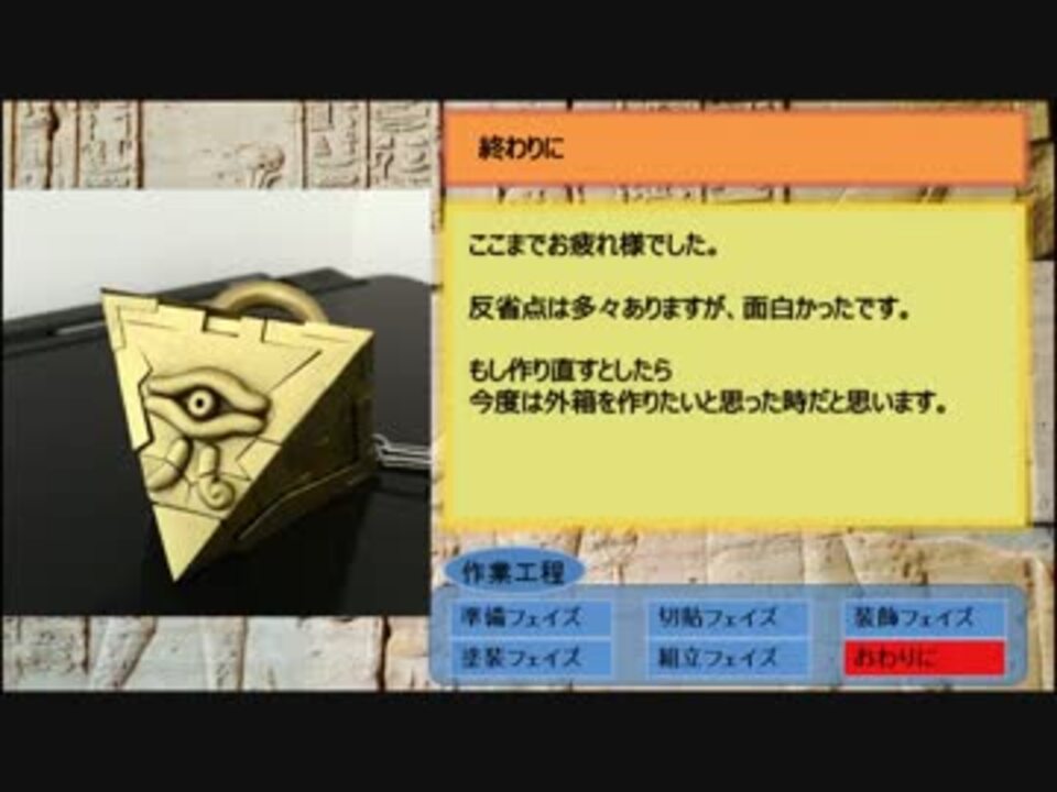 遊戯王劇場版に感化されて千年パズルを作ってみました!<br />千年パズルを作るのは初めてなので、生暖かく見て頂ければと思います!<br /><br />~追記~<br />Instagram:kagekoma <br />これまでに作ったものの写真が主です。<br /><br />~追記の追記~<br />なぁにこれぇ(焦)。たくさんのご視聴ありがとうございます!<br />また面白いもの作ります!<br /><br />お借りしたBGM:<br />甘茶の音楽工房 様<br />よっしー 様<br />