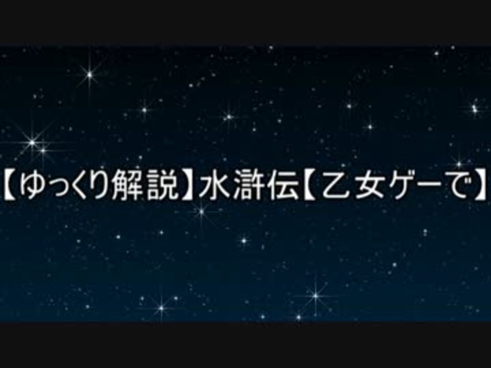 ご視聴いただきありがとうございます。<br />108星が囁いたのか、一気に作り上げた動画です。<br />太平記→<a href="https://www.nicovideo.jp/watch/sm29020133" class="watch">sm29020133</a> <br /><br />星空や中華風の背景は、ニコニ・コモンズの方達から素材をいただきました。ありがとうございます。<br />音楽は【オリジナル】愁い酒【BGM】作者名:yen 様 ありがとうございました。<br />なお、作中で紹介したゲームの情報は2016年5月現在です。<br />本編ルートのキャラが増えてくれたらいいな(願望)。<br />