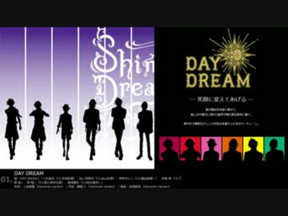 うたの☆プリンスさまっ♪Shining Dream CD<br />2016年8月17日発売<br /><br />01.DAY DREAM<br />歌:DAY DREAM <br />一十木音也(CV.寺島拓篤)<br />四ノ宮那月(CV.谷山紀章)<br />神宮寺レン(CV.諏訪部順一)<br />来栖 翔(CV.下野 紘)<br />寿 嶺二(CV.森久保祥太郎)<br />黒崎蘭丸(CV.鈴木達央)<br /><br />作詞:上松範康(Elements Garden)<br />作曲:藤間 仁(Elements Garden)<br />編曲:岩橋星実(Elements Garden)<br /><br /><br />02.NIGHT DREAM<br />歌:NIGHT DREAM <br />聖川真斗(CV.鈴村健一)<br />一ノ瀬トキヤ(CV.宮野真守)<br />愛島セシル(CV.鳥海浩輔)<br />美風 藍(CV.蒼井翔太)<br />カミュ(CV.前野智昭)<br /><br />作詞:上松範康(Elements Garden)<br />作曲:藤田淳平(Elements Garden)<br />編曲:藤永龍太郎(Elements Garden)<br />