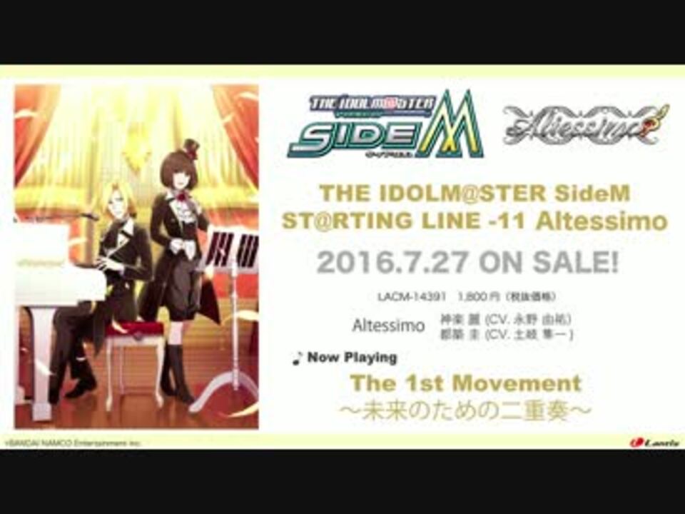 THE IDOLM@STER SideM ST@RTING LINE-10 Altessimo<br />2016年7月27日発売!<br /><br />Altessimo・・・都築 圭 (CV.土岐 隼一)<br /> 神楽 麗 (CV.永野 由祐)<br /><br /><CD INDEX><br />01.The 1st Movement ~未来のための二重奏~<br /> 作詞:真崎エリカ 作曲:小高光太郎、UiNA 編曲:小高光太郎<br />02.Drama part 1 ~Altessimo~<br />03.Never end「Opus」<br /> 作詞:真崎エリカ 作曲:小高光太郎、UiNA 編曲:小高光太郎<br />04.Drama part 2 ~Altessimo & THE 虎牙道~<br />05.DRIVE A LIVE(Altessimo ver.)<br /> 作詞・作曲:BNSI(柿埜嘉奈子) 編曲:滝澤俊輔[TRYTONELABO]<br /><br /><a href="https://www.youtube.com/watch?v=QXpexuRlZz0より" target="_blank" rel="noopener nofollow">https://www.youtube.com/watch?v=QXpexuRlZz0より</a><br />