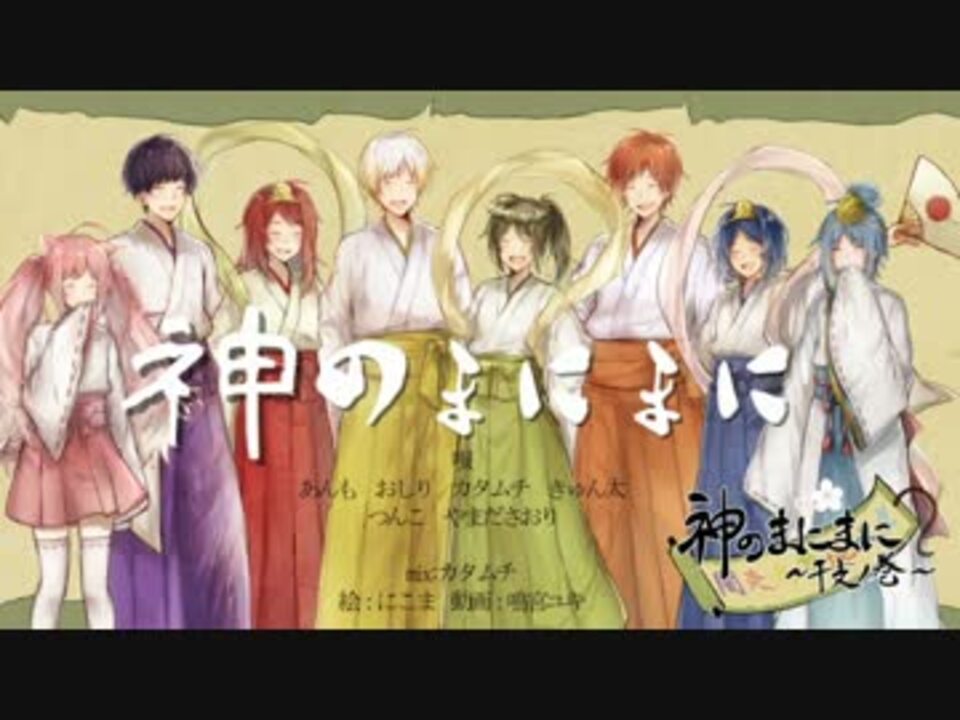 遠い昔―<br />あるところに十二支と仲良く暮らす<br />6人の神様がいたそうな。<br />6人の神様は、来る日も来る日も<br />人々の願いを叶え続けていましたが、<br />いつしかそんな生活に疲れ果ててしまいました。<br />そして、ついには自分たちの存在をも否定して<br />しまうほどになってしまったのです。<br /><br />この物語は、そんな神様たちのお話。<br /><br />本家様→【<a href="https://www.nicovideo.jp/watch/sm22831329" class="watch">sm22831329</a>】<br /><br />光/辰・戌 あんも <a href="https://www.nicovideo.jp/mylist/26627561" target="_blank" rel="noopener">mylist/26627561</a><br />闇/牛・子 カタムチ <a href="https://www.nicovideo.jp/mylist/39348103" target="_blank" rel="noopener">mylist/39348103</a><br />炎/酉・亥 つんこ <a href="https://www.nicovideo.jp/mylist/42048835" target="_blank" rel="noopener">mylist/42048835</a><br />草/未・兎 やまださおり <a href="https://www.nicovideo.jp/mylist/39555765" target="_blank" rel="noopener">mylist/39555765</a><br />水/巳・寅 きゅん太 <a href="https://www.nicovideo.jp/mylist/29512920" target="_blank" rel="noopener">mylist/29512920</a><br />地/猿・午 Osiri <a href="https://www.nicovideo.jp/mylist/33508557" target="_blank" rel="noopener">mylist/33508557</a><br /><br />Movie:鳴宮ユキ <a href="https://www.nicovideo.jp/mylist/55808099" target="_blank" rel="noopener">mylist/55808099</a><br />Mix:カタムチ <a href="https://www.nicovideo.jp/mylist/39348103" target="_blank" rel="noopener">mylist/39348103</a><br />Illust:にこま <a href="https://www.nicovideo.jp/mylist/38789734" target="_blank" rel="noopener">mylist/38789734</a><br /><a href="http://www.pixiv.net/member.php?id=2277453" target="_blank" rel="noopener nofollow">http://www.pixiv.net/member.php?id=2277453</a><br /><br /><br />過去合唱→<a href="https://www.nicovideo.jp/mylist/56869803" target="_blank" rel="noopener">mylist/56869803</a>