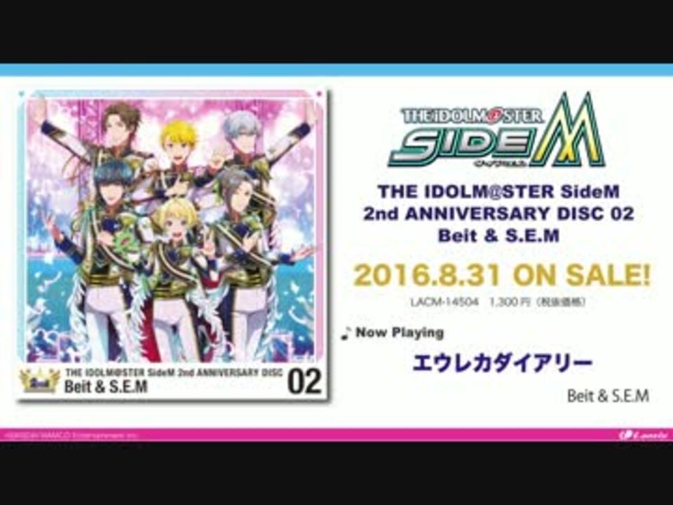 THE IDOLM@STER SideM 2nd ANNIVERSARY DISC 02 Beit & S.E.M<br />2016.8.31 ON SALE!<br /><br />歌:Beit [鷹城恭二 (CV.梅原裕一郎), ピエール(CV.堀江瞬), 渡辺みのり (CV.高塚智人)] <br /> S.E.M [硲道夫 (CV.伊東健人), 舞田類 (CV.榎木淳弥), 山下次郎 (CV.中島ヨシキ)]<br /><br /><CD INDEX><br />01.エウレカダイアリー<br />歌:Beit & S.E.M 作詞:真崎エリカ 作曲・編曲:本多友紀(Arte Refact)<br />02.Fun! Fun! Festa!<br />歌:Beit 作詞:真崎エリカ 作曲・編曲:矢鴇つかさ(Arte Refact)<br />03.サ・ヨ・ナ・ラ Summer Holiday<br />歌:S.E.M 作詞:松井洋平 作曲・編曲:伊藤 賢<br /><br /><a href="https://www.youtube.com/watch?v=KrVK84zIPu8より" target="_blank" rel="noopener nofollow">https://www.youtube.com/watch?v=KrVK84zIPu8より</a><br />