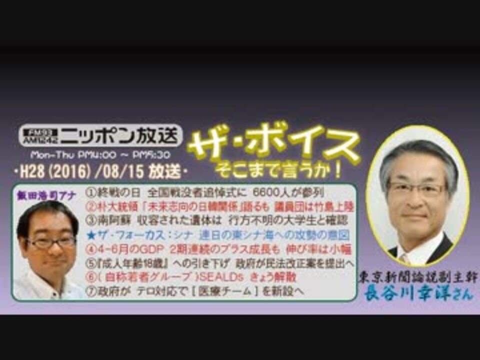 今回、6本目の題目『SEALDs』の文字を見てズッコケた、そこのアナタ!(って私のことですハイw) 安心してください! はいて(吐き捨てて)ますよ!<br />てか、本編の解説では、「若者」という部分にツッコミを入れなかったりと、何だかイヤーンな感じだったんですが、エンディングの所で、常連さんのナイスなツイートに答える形でケチョンケチョンに斬り捨てたおかげで、やっと溜飲が下がったという……、最初からその調子でやってくださいよ!(^^;<br /><br />しかしコレ、どうせ看板付け替えるだけだろうし、そもそもが「この番組で取り上げるようなことッスか!?」という話ですよねぇ。同じ『解散』ネタなら、国会答弁にもなったSMAP話の方が良かったと思いますわw<br />※街ステ飛ばし→ <a href="#" class="seekTime" data-seekTime="36:46" onclick="seekNicoPlayer('#36:46'); return false;">#36:46</a><br />□<a href="https://www.nicovideo.jp/mylist/50437895" target="_blank" rel="noopener">mylist/50437895</a>□<a href="https://www.nicovideo.jp/mylist/36340069" target="_blank" rel="noopener">mylist/36340069</a>□<a href="https://www.nicovideo.jp/mylist/41644857" target="_blank" rel="noopener">mylist/41644857</a>