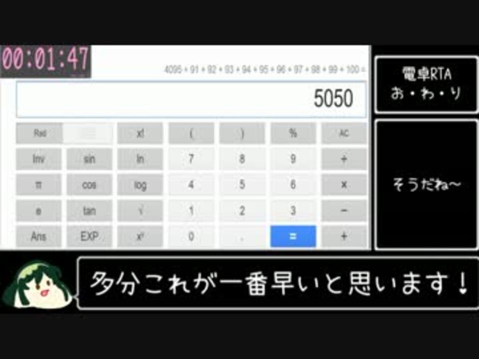 <b>ゲーム画面が映っていなければ参加していいんだよね?(タメ口)</b><br /><br />ボツにするか迷っていた<a href="https://www.nicovideo.jp/watch/sm29480377" class="watch">sm29480377</a>が思いの外好評で<br />嬉しくなって走りました電卓RTA!<br /><br /><b>ルールは簡単!</b><br />Googleの電卓を用いて1~100を順番に足し算していき、<br />結果が5050になればクリア!<br />さあ君はどれだけ速くクリアできるか!?<br /><br />因みに上の動画を投稿した後録画含めゼロから作り始めました。<br />何が言いたいのかというと、<br /><br /><b>電卓RTAなら今からでもひじき祭に参加できる!</b><br />さあ画面の前の皆も一緒に走ろう!<br /><br /><b>ズンダー改の人<br /><a href="https://seiga.nicovideo.jp/user/illust/30337032" target="_blank" rel="noopener">user/illust/30337032</a></b><br /><br />ボイロスライムってbiimシステムと相性いいよね。<br /><br />【追記】<br />うp主の偉大な記録を踏み潰していく無慈悲な人々→<a href="https://www.nicovideo.jp/mylist/56767455" target="_blank" rel="noopener">mylist/56767455</a>