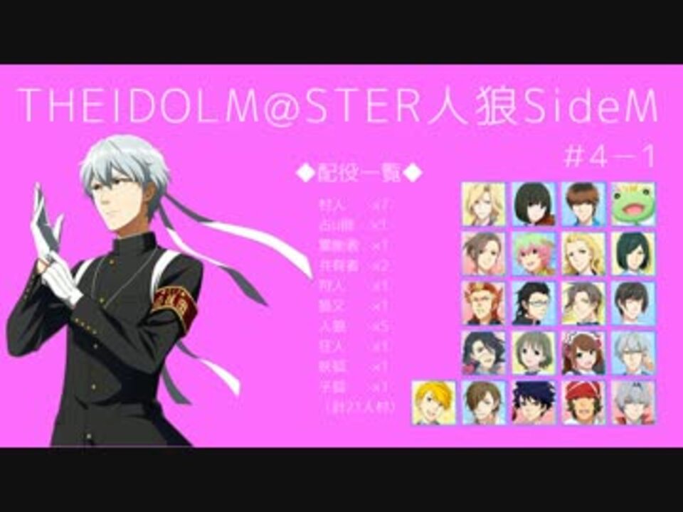 BEMのCDがとてもハッピーにあふれてて幸せです。<br />ちょっと8月が過ぎてしまいましたが、4回戦スタートです。今回は子狐ありの21人村になります。<br />5回戦と同時進行の予定です。2ndライブまでに完走できればいいな……。<br /><b>9/4追記:画質が微妙なのでエンコ直し版をうpしました→<a href="https://www.nicovideo.jp/watch/sm29587020" class="watch">sm29587020</a></b><br /><br />【宣伝】<br />定期的にわかめて鯖(<a href="http://jinrou.dip.jp/~jinrou/)にてMマスRP人狼が開催されています" target="_blank" rel="noopener nofollow">http://jinrou.dip.jp/~jinrou/)にてMマスRP人狼が開催されています</a>。<br />詳細はGM(私ではなく友人です)のTwitter垢にて→@sideM_jinro_GM<br /><br />*別卓の直截的なネタバレなど、うp主判断でコメントを非表示にすることがあります。ご了承下さい。<br /><br />【前】#4-0 <a href="https://www.nicovideo.jp/watch/sm28427894" class="watch">sm28427894</a> <br />【次】#4-2 <a href="https://www.nicovideo.jp/watch/sm29703975" class="watch">sm29703975</a><br /><br />Mマス人狼動画 <a href="https://www.nicovideo.jp/mylist/50019571" target="_blank" rel="noopener">mylist/50019571</a> <br />MマスMMD動画 <a href="https://www.nicovideo.jp/mylist/47350312" target="_blank" rel="noopener">mylist/47350312</a> <br /><br />twitter→@sanagi_cocoonM