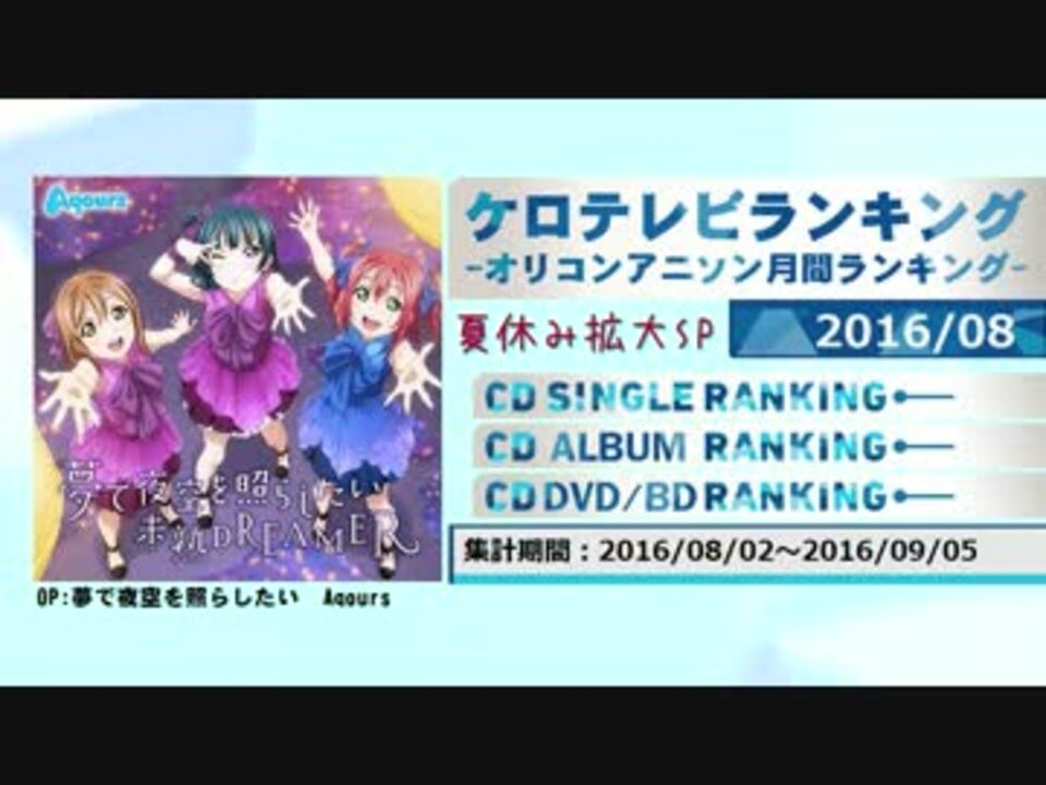 [HP]<a href="http://www20.atwiki.jp/keroro00innovator/" target="_blank" rel="noopener nofollow">http://www20.atwiki.jp/keroro00innovator/</a><br />デイリー:<a href="http://www20.atwiki.jp/keroro00innovator/pages/25.html" target="_blank" rel="noopener nofollow">http://www20.atwiki.jp/keroro00innovator/pages/25.html</a><br />週間:<a href="http://www20.atwiki.jp/keroro00innovator/pages/26.html" target="_blank" rel="noopener nofollow">http://www20.atwiki.jp/keroro00innovator/pages/26.html</a><br />2016年8月度のランキングです。<br />基本的にアニメソングのみ。除外基準:<a href="http://www20.atwiki.jp/keroro00innovator/pages/4.html" target="_blank" rel="noopener nofollow">http://www20.atwiki.jp/keroro00innovator/pages/4.html</a><br />7月:<a href="https://www.nicovideo.jp/watch/sm29368064" class="watch">sm29368064</a> 9月:10月4日頃うp ランキング一覧:<a href="https://www.nicovideo.jp/mylist/47656494" target="_blank" rel="noopener">mylist/47656494</a>