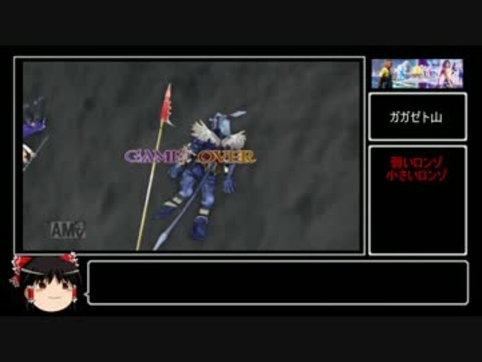 Copyright (C) 2001, 2003, 2019 SQUARE ENIX CO., LTD. All Rights Reserved.<br>ご視聴ありがとうございます!<br>縛り項目 3人で攻略スフィア無し&キマリ縛り(なるべく)<br>1調合の禁止・2召喚の禁止・3使う禁止・4石ガード禁止<br>キマリソロ攻略(スフィアちょっと使う)<br>縛り項目は随時追加となります<br>たくさんの宣伝ありがとうございます<br>大変励みになりますが…プレッシャーにも…!<br>キマリアビリティ使用回数=残り29回<br>前回⇒<a href="https://www.nicovideo.jp/watch/sm29573919" class="watch">sm29573919</a><br>次回⇒<a href="https://www.nicovideo.jp/watch/sm29865144" class="watch">sm29865144</a><br>FF7⇒<a href="https://www.nicovideo.jp/mylist/24475663" target="_blank" rel="noopener">mylist/24475663</a> FF4⇒<a href="https://www.nicovideo.jp/mylist/31905690" target="_blank" rel="noopener">mylist/31905690</a><br>FF10⇒<a href="https://www.nicovideo.jp/mylist/47887983" target="_blank" rel="noopener">mylist/47887983</a>生放送でキマリ攻略してたり⇒co3029417<br>ツブヤイター 動画更新情報してるお!<br><a href="https://twitter.com/dhuerunahito" target="_blank" rel="noopener nofollow">https://twitter.com/dhuerunahito</a><br>