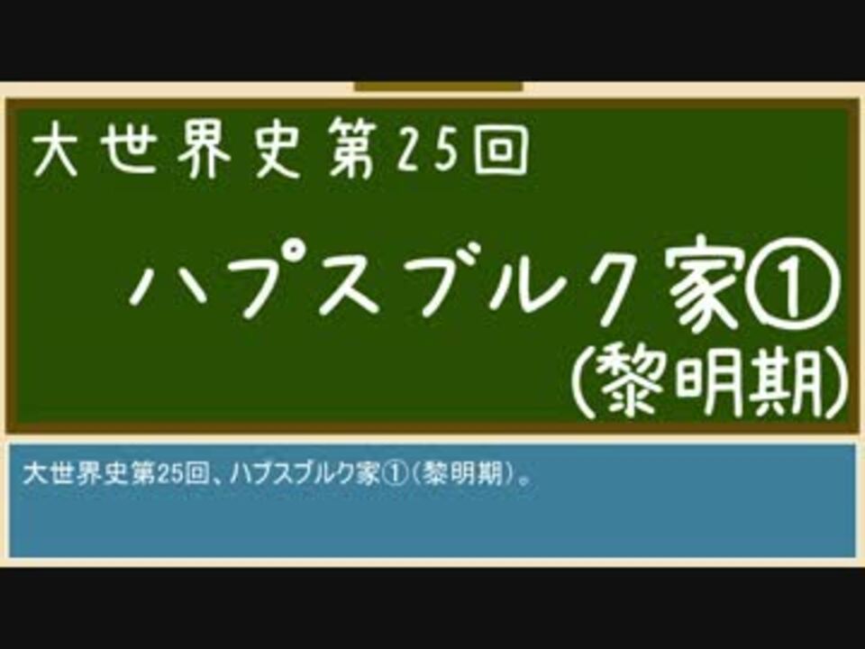 神聖ローマ帝国のWikipedia・大百科の充実っぷりに驚き。<br />扱いたい話の候補が尽きません。<br /><br />*歴史の知識を深める動画<br />*世界史B用語集に載っているような単語が範囲<br />*週1ペースを目指している<br /><br />第24回(イスラーム教~六信五行)→<a href="https://www.nicovideo.jp/watch/sm29629177" class="watch">sm29629177</a><br />第26回(ハプスブルク家~カール5世)→<a href="https://www.nicovideo.jp/watch/sm29762737" class="watch">sm29762737</a><br />【大世界史】<a href="https://www.nicovideo.jp/mylist/55435393" target="_blank" rel="noopener">mylist/55435393</a><br /><br />◇こんなのも作ってます<br />【ゆっくりと散歩】<a href="https://www.nicovideo.jp/mylist/55732851" target="_blank" rel="noopener">mylist/55732851</a><br />【Fate元ネタ】<a href="https://www.nicovideo.jp/mylist/55435486" target="_blank" rel="noopener">mylist/55435486</a><br />
