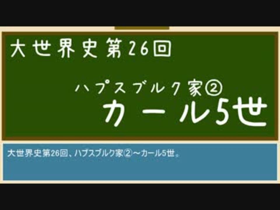 宣伝してくれた方々、本当にありがとうございます。<br />ネット回線が千切れて、危うく投稿できないところでした。<br /><b>訂正:2分40秒台、マクシミリアン1世はカール5世の祖父でした!ご指摘ありがとうございます!</b><br />*歴史の知識を深める動画<br />*世界史B用語集に載っているような単語が範囲<br />*週1ペースを目指している<br /><br />第25回(ハプスブルク家①~黎明期)→<a href="https://www.nicovideo.jp/watch/sm29714317" class="watch">sm29714317</a><br />第27回(ナスル朝)→<a href="https://www.nicovideo.jp/watch/sm29804988" class="watch">sm29804988</a><br />【大世界史】<a href="https://www.nicovideo.jp/mylist/55435393" target="_blank" rel="noopener">mylist/55435393</a><br /><br />◇こんなのも作ってます<br />【ゆっくりと散歩】<a href="https://www.nicovideo.jp/mylist/55732851" target="_blank" rel="noopener">mylist/55732851</a><br />【Fate元ネタ】<a href="https://www.nicovideo.jp/mylist/55435486" target="_blank" rel="noopener">mylist/55435486</a><br />