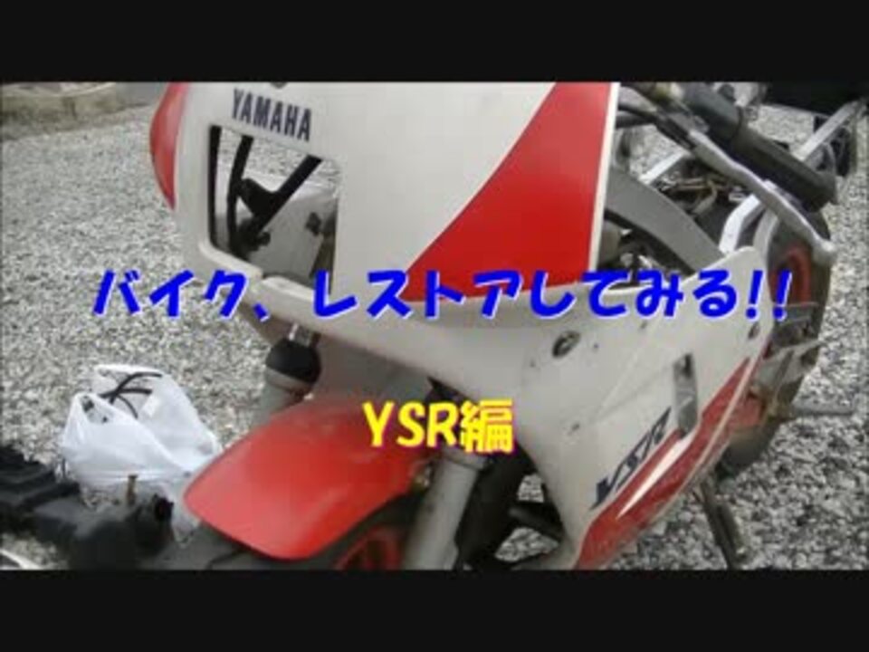 Team Exceedメンバーがお送りする<font color="#ff0080" size="4">“レストア企画第1弾”</font>「バイク、レストアしてみる!!」<br /><br />今回のレストア車両は【YSR50】となっております。<br />亜斗夢、べっくす、よっしーの3人がレストアをして、解説をしてみたり、時にはくだらない話をしたりと<br />和気藹々とやっていきたいと考えてますので、よろしくお願いしますm(_ _)m<br /><br />【追記】バイクの車検が400cc以上と知らなかったので、車検を通すと言ってます。混乱させてしまい申し訳ありません。<br /><br />【新作】part6→<a href="https://www.nicovideo.jp/watch/sm33198449" class="watch">sm33198449</a><br /><br />・part2→<a href="https://www.nicovideo.jp/watch/sm29862310" class="watch">sm29862310</a> ・part3→<a href="https://www.nicovideo.jp/watch/sm30778459" class="watch">sm30778459</a><br /><br />・マイリスト→<a href="https://www.nicovideo.jp/mylist/57191542" target="_blank" rel="noopener">mylist/57191542</a><br /><br />・亜斗夢のtwitter→@atomu_niconico<br />・Team Exceedのコミュ→co3400970<br /><br /><br />
