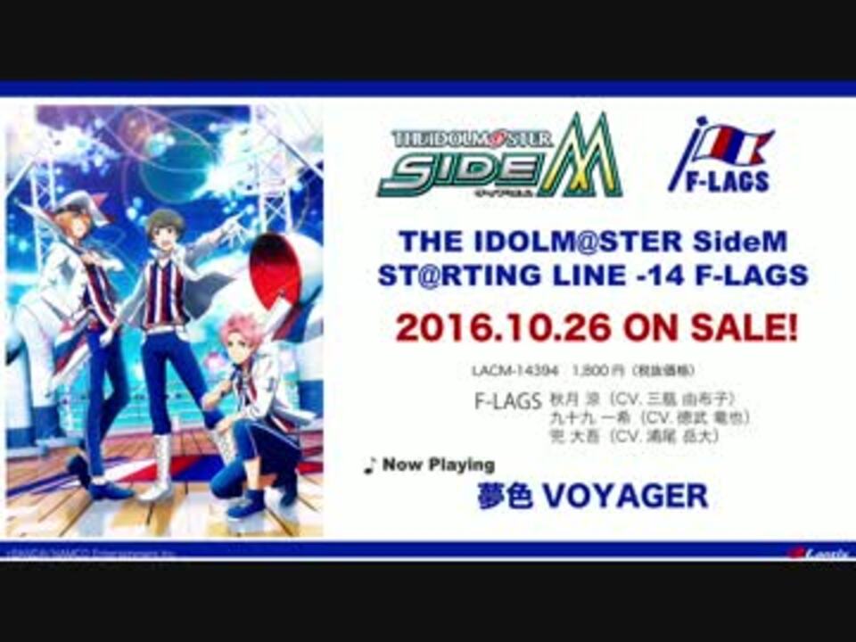 THE IDOLM@STER SideM ST@RTING LINE-14 F-LAGS<br />2016年10月26日発売!<br /><br />F-LAGS・・・秋月涼(CV.三瓶由布子)<br /> 兜大吾(CV.浦尾岳大)<br /> 九十九一希(CV.徳武竜也)<br /><br /><CD INDEX><br />01.夢色VOYAGER<br /> 作詞:結城アイラ 作曲:原田篤(Arte Refact) 編曲:山本恭平(Arte Refact)<br />02.Drama part 1 ~F-LAGS~<br />03.With...STORY<br /> 作詞:結城アイラ 作曲・編曲:斎藤仁久、小高光太郎<br />04.Drama part 2 ~F-LAGS & もふもふえん~<br />05.DRIVE A LIVE(F-LAGSver.)<br /> 作詞・作曲:BNSI(柿埜嘉奈子) 編曲:滝澤俊輔[TRYTONELABO]<br /><br /><a href="https://www.youtube.com/watch?v=upI571JLP5Aより" target="_blank" rel="noopener nofollow">https://www.youtube.com/watch?v=upI571JLP5Aより</a><br />