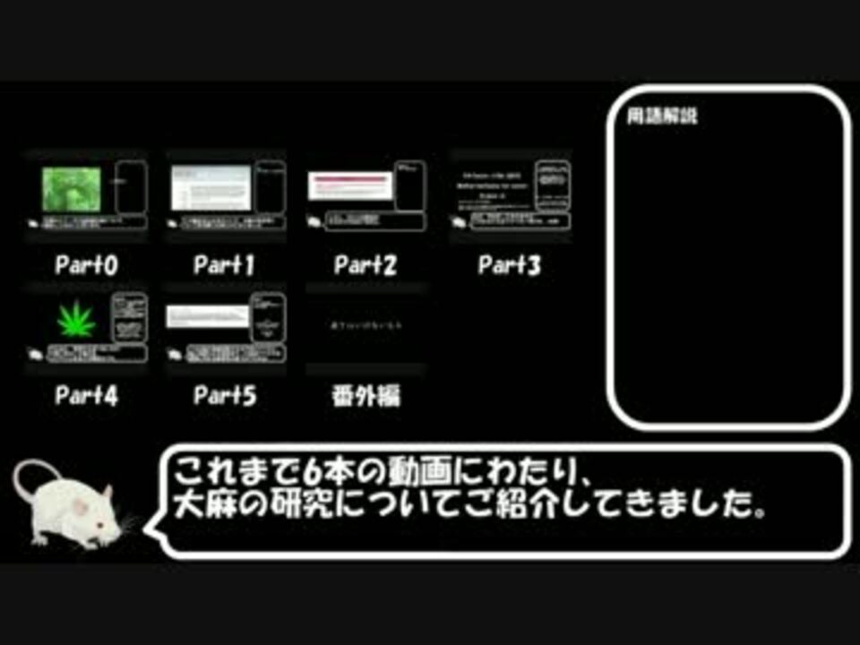 本当は大麻の良い面悪い面を半分ずつくらいでやりたかったんですが・・・<br />良い面でまともな研究が少なすぎるんだよ!!!<br />広告誠にアリシャス!<br />2016年10/31,11/1,2,3,4,10<br />2017年3/24<br /><br />Part5→<a href="https://www.nicovideo.jp/watch/sm29897354" class="watch">sm29897354</a><br />これまで作ったもの<br /><a href="https://www.nicovideo.jp/mylist/55689059" target="_blank" rel="noopener">mylist/55689059</a><br />医療大麻マイリスト<br /><a href="https://www.nicovideo.jp/mylist/56778921" target="_blank" rel="noopener">mylist/56778921</a><br /><br />ご意見、ご感想、ご要望などはこちらへ<br /><a href="https://twitter.com/lifesch_doc_P" target="_blank" rel="noopener nofollow">https://twitter.com/lifesch_doc_P</a><br /><br />お借りしたイラスト<br />Licensed under Creative Commons 表示 4.0 ©Togo picture gallery by DBCLS<br />お借りしたBGM<br /><a href="https://dova-s.jp/bgm/play4484.html" target="_blank" rel="noopener nofollow">https://dova-s.jp/bgm/play4484.html</a><br />