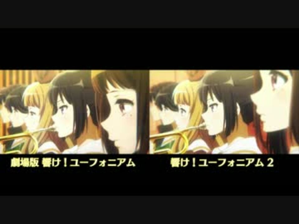 左が「劇場版 響け!ユーフォニアム」、右が「響け!ユーフォニアム2」です。<br />香織先輩やあすか先輩の微妙な表情の違いがいいですね。<br /><br />※2つともテンポが違うため、大体2〜4小節ごとに手作業で速度調整をしています。<br /> 多少雑な点はご容赦下さい。<br /> 2期基準で劇場版を速度調整しています。<br /><br /><font color="red" size="1">1280x720 29.970fps 10Mbps 320kbps 1pass</font><br /><font size="1">速度の詳細→<font color="#0044cc"><a href="http://bit.ly/2esZ59C" target="_blank" rel="noopener nofollow">http://bit.ly/2esZ59C</a></font></font><br /><br /><br />【追記】<br />音は映像通りレフトに劇場版を、ライトに2期を振っています。<br /><a href="#" class="seekTime" data-seekTime="1:51" onclick="seekNicoPlayer('#1:51'); return false;">#1:51</a>~3:09、<a href="#" class="seekTime" data-seekTime="4:04" onclick="seekNicoPlayer('#4:04'); return false;">#4:04</a>~5:32は共に同じ映像というわけではなく、劇場版ではカットされている部分ため2期の映像・音声になります。