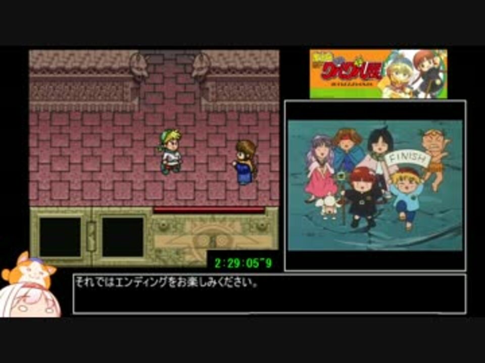 シーズンオフになったので初投稿です。<br />左下の元イラストはこちら→<a href="https://seiga.nicovideo.jp/seiga/im5150457" target="_blank" rel="noopener">im5150457</a><br />これで最後です。もう会うことはないでしょう。<br /><br />レギュレーション→「トロルの飲み物」禁止、「宝箱及び敵配置の再現」許可<br />計測地点→タイトルでスタートした瞬間~エンディングが終わり「ばいばーい」の台詞が終わる瞬間まで<br /><a href="https://www.nicovideo.jp/watch/sm30041704" class="watch">sm30041704</a>←前<br />魔法陣グルグルRTA→<a href="https://www.nicovideo.jp/mylist/57515550" target="_blank" rel="noopener">mylist/57515550</a><br />これ以外のRTA→<a href="https://www.nicovideo.jp/mylist/53641103" target="_blank" rel="noopener">mylist/53641103</a><br />チャート→(まだ)ないです<br />使用機種→snes9xv1.53<br /><br />動画にしないor向かないものは生放送でやってます→co1955982<br />