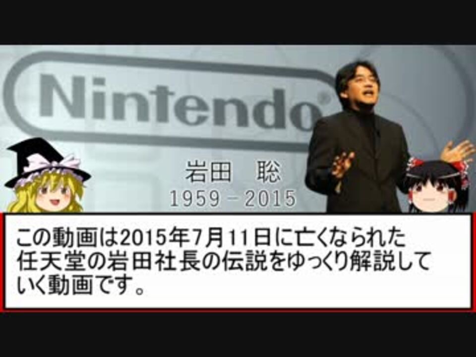 任天堂岩田社長のゆっくり解説動画です。<br /><br /><font size="5">修正させて頂きました。→BGM調整版<a href="https://www.nicovideo.jp/watch/sm30057272" class="watch">sm30057272</a></font><br /><br />ニコニコユーザーに忘れて欲しくなくてつくりました。<br /><br />追記:たくさんの再生、コメント、マイリスト、広告、本当にありがとうございます。<br />ここまでのびるとは思っていませんでした。<br />また、コメントに頂きましたOPとシンゴジラ・エヴァのBGMがあまりにも<br />大きすぎる件について、本当に申し訳ございません。<br /><br />【マリタイムメモリー】<a href="https://www.nicovideo.jp/watch/sm28777718" class="watch">sm28777718</a>←前回 次回→【ハル研究所再建編】<a href="https://www.nicovideo.jp/watch/sm30105468" class="watch">sm30105468</a><br /><br />投稿動画一覧<a href="https://www.nicovideo.jp/mylist/41262889" target="_blank" rel="noopener">mylist/41262889</a><br /><br />【参考サイト】<br />ほぼ日刊イトイ新聞岩田聡さんのコンテンツ<br />ゲーマーはもっと経営者を目指すべき特別篇<br />樹の上の秘密基地<br />Wikipedia<br /><br />【広告して頂いた方々】本当にありがとうございました。<br />tomasさん、アルファさん、zinnさん、ああああさん、TGさん、よりみちさん、ゲストさん、Asterさん、アルファさん、ピサロナイトさん、森の妖精さん、りんどうさん、ファンさん、無銘さん、日向時間さん、snmrさん、kankonさん、ネスさん、てらでいんさん、どせいさん、ナス科のナスカさん、よしゆきよしぞうさん、ぽんにゃさん、はっぴぃおじさん、ぬてらさん、けーしぃさん、ジュンさん、ConSomeさん、bakuさん、れお専務さん、ニッコリさん、くろますさん、ありがとうさん、東郷士現さん(順不同)