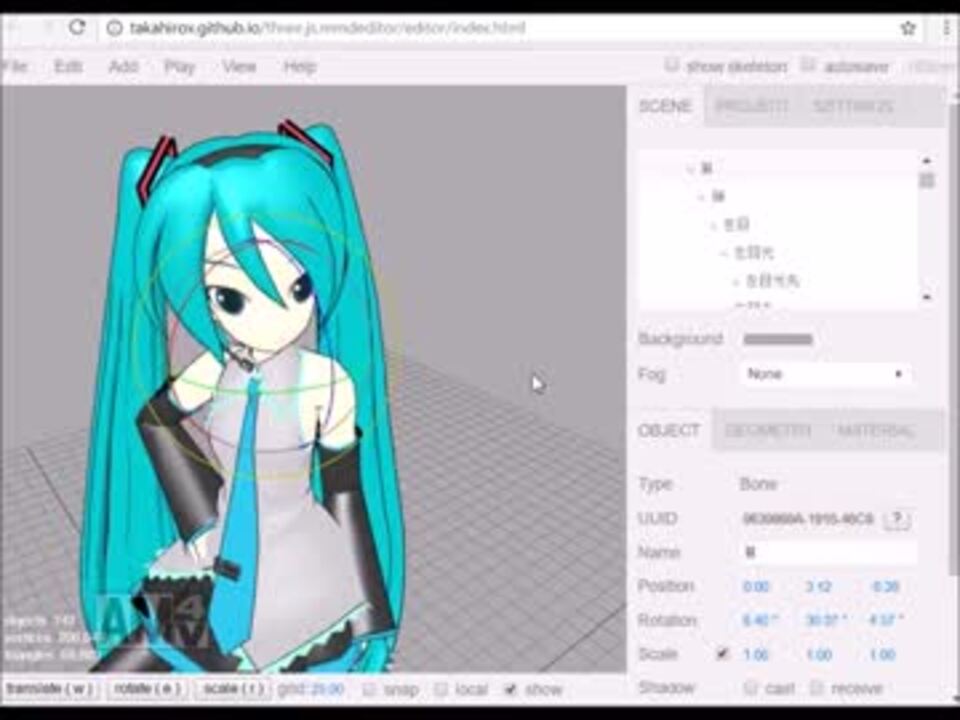 前(MMDxWebアプリ): <a href="https://www.nicovideo.jp/watch/sm279561563" class="watch">sm279561563</a><br />次(ブラウザ上でMMDミクのライブをリアルタイム処理で) :<a href="https://www.nicovideo.jp/watch/sm30124044" class="watch">sm30124044</a><br />マイリスト: <a href="https://www.nicovideo.jp/mylist/49125767" target="_blank" rel="noopener">mylist/49125767</a><br /><br />やっぱりアニメーション編集もできたほうがいいですかね。<br /><br />オンラインデモ<br />Editor <a href="http://takahirox.github.io/three.js.mmdeditor/editor/index.html" target="_blank" rel="noopener nofollow">http://takahirox.github.io/three.js.mmdeditor/editor/index.html</a><br />A-FramexMMD <a href="https://github.com/takahirox/a-mmd" target="_blank" rel="noopener nofollow">https://github.com/takahirox/a-mmd</a><br />Three.js MMD example <a href="https://threejs.org/examples/#webgl_loader_mmd" target="_blank" rel="noopener nofollow">https://threejs.org/examples/#webgl_loader_mmd</a><br /><br />東方風STGブラウザゲーム→<a href="https://www.nicovideo.jp/mylist/38547755" target="_blank" rel="noopener">mylist/38547755</a><br />