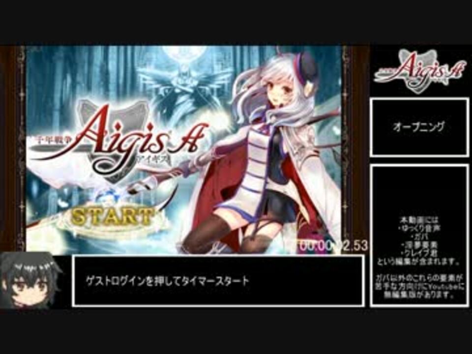 <font size="6" color="#ff0000">更新されました!!→<a href="https://www.nicovideo.jp/watch/sm30245054" class="watch">sm30245054</a></font>(2016/12/17)<br />めでたくサービス開始から3周年なので端末を買い換えたついでに走ってみました。<br />初投稿です。<br /><br />[基本事項]<br />・計測はゲストプレイを押してから王城奪還クリア画面の☆が3つ表示されるまで<br />・女神の加護不使用<br />・プレミアム召還不使用<br />・時期限定のイベント、ミッション、キャンペーンアイテムは使用しない<br /><br />[プレイ環境]<br />千年戦争アイギスA Ver1.2.1<br />iPhone6S(64GB) iOS10.0.2<br /><br />[part1(オープニング~住民救出3まで)]ここ [part2(火事場泥棒~城門の戦いまで)]<a href="https://www.nicovideo.jp/watch/sm30138336" class="watch">sm30138336</a><br /><a href="https://www.nicovideo.jp/mylist/57720952" target="_blank" rel="noopener">mylist/57720952</a><br />Youtube(Unedited)→<a href="https://youtu.be/WJ5MXbFmaMI" target="_blank" rel="noopener nofollow">https://youtu.be/WJ5MXbFmaMI</a><br /><br />たくさんの広告ありがとナス!<br />