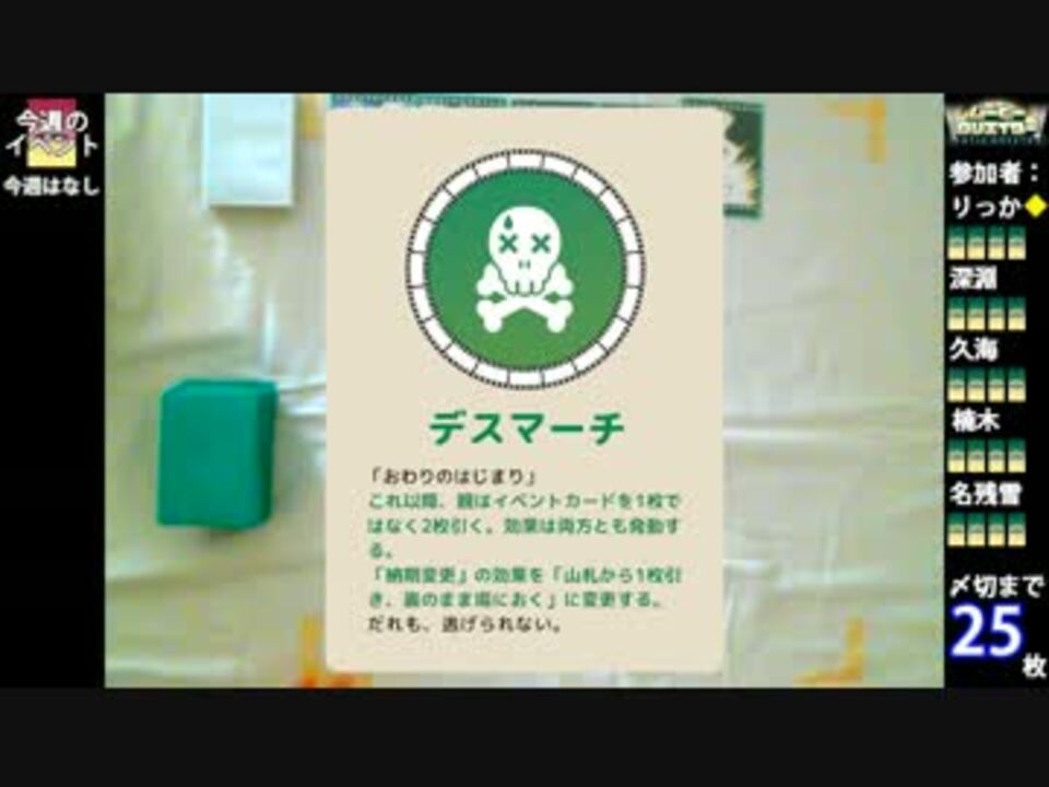 「デスマーチ」……それは〆切を倒す、それだけを成すためだけの死の行軍。行きつく先には、ただ屍のみ……。<br /><br />スタヂオひまつぶしが制作したオリジナルパーティーゲーム「ムービークリエイター」のプレイ風景をまとめました第四弾。<br /> 今回は12/11日の『ゲームマーケット2016』にて頒布予定の拡張パック「怒りのデスマーチ」を使用した映像制作! 果たしてメンバーはこの死の行軍を乗り越え映画を完成させることはできるのか!?<br /><br /><br />3本目⇒【<a href="https://www.nicovideo.jp/watch/sm27979341" class="watch">sm27979341</a>】 5本目⇒【<a href="https://www.nicovideo.jp/watch/sm33114176" class="watch">sm33114176</a>】<br />一覧⇒【<a href="https://www.nicovideo.jp/mylist/51836192" target="_blank" rel="noopener">mylist/51836192</a>】<br /><br />CoC「沼」【<a href="https://www.nicovideo.jp/mylist/49317018" target="_blank" rel="noopener">mylist/49317018</a>】 CoC「宴」⇒【<a href="https://www.nicovideo.jp/mylist/34167065" target="_blank" rel="noopener">mylist/34167065</a>】 ラヂオ⇒【<a href="https://www.nicovideo.jp/mylist/38209800" target="_blank" rel="noopener">mylist/38209800</a>】 その他作品集⇒【<a href="https://www.nicovideo.jp/mylist/8108930" target="_blank" rel="noopener">mylist/8108930</a>】<br />