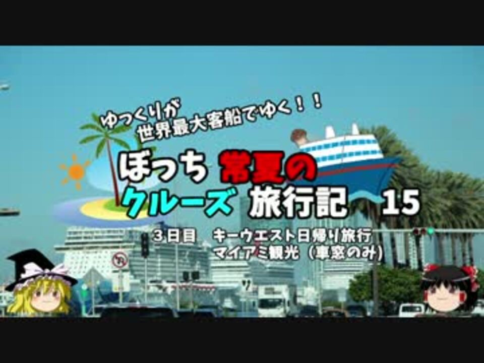 リアルでは明日から道後温泉に家族旅行に行ってきます!<br /><br />動画ではもう1組のお客さんを迎えに行ってます!<br />このご夫婦がいなければ、うぷぬしは来れなかったので感謝!<br /><br />第一話→<a href="https://www.nicovideo.jp/watch/sm29940078" class="watch">sm29940078</a><br /><br />第1章・・・出発編<br />第2章・・・キーウエスト編<font color="red">←今ココ</font><br />第3章・・・クルーズ前編<br />第4章・・・クルーズ後編<br />第5章・・・FLD編<br />第6章・・・帰路編<br /><br /><font color="red">コミュ→co2910020</font><br />twitter→@ryontan<br /><br /><a href="https://www.nicovideo.jp/watch/sm30221996" class="watch">sm30221996</a>←前回 <font color="red">次回→16話<a href="https://www.nicovideo.jp/watch/sm30250259" class="watch">sm30250259</a></font><br /><br />今作 クルーズ旅行記→<a href="https://www.nicovideo.jp/mylist/57397685" target="_blank" rel="noopener">mylist/57397685</a><br />今作 車中泊旅行記→<a href="https://www.nicovideo.jp/mylist/54706524" target="_blank" rel="noopener">mylist/54706524</a><br />前作 ドイツ周遊記→<a href="https://www.nicovideo.jp/mylist/54938346" target="_blank" rel="noopener">mylist/54938346</a><br />前々作 北海道旅行記→<a href="https://www.nicovideo.jp/mylist/52618057" target="_blank" rel="noopener">mylist/52618057</a><br />前前々作 アメリカ横断記→<a href="https://www.nicovideo.jp/mylist/48621785" target="_blank" rel="noopener">mylist/48621785</a><br />