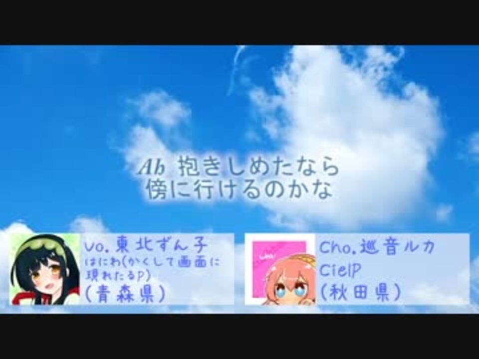 東北在住または出身のボカロPさんや作詞家さん、そして全国の有志の方々によるコラボです!<br />この曲を聞いてくださった方々が少しでも「ほっとした気持ち」や「前向きな気持ち」になってもらえたら嬉しいです。<br /><br />歌ってみた動画や学校・イベント等での歌唱等、ぜひご自由にお使いくださいませ。<br />MP3,カラオケ,楽譜等→<a href="http://sound.jp/ciel/" target="_blank" rel="noopener nofollow">http://sound.jp/ciel/</a><br /><br />CielP <a href="https://www.nicovideo.jp/mylist/7483942" target="_blank" rel="noopener">mylist/7483942</a><br />たかし <a href="https://www.nicovideo.jp/mylist/35563355" target="_blank" rel="noopener">mylist/35563355</a><br />さおとめ <a href="https://www.nicovideo.jp/mylist/53539032" target="_blank" rel="noopener">mylist/53539032</a><br />さとしき <a href="https://www.nicovideo.jp/mylist/28501923" target="_blank" rel="noopener">mylist/28501923</a><br />はにわ(かくして画面に現れたるP) <a href="https://www.nicovideo.jp/mylist/36082119" target="_blank" rel="noopener">mylist/36082119</a><br />AUG<br />ユイU・ω・U(パパイトP) <a href="https://www.nicovideo.jp/mylist/8398204" target="_blank" rel="noopener">mylist/8398204</a><br /><br />ラストのコーラスは全国からメンバーを募集しました。<br />Noelさん<br />ちゅーたさん<br />柳さん<br />Haruさん<br /><br />画像をお借りした方々の表記は動画内に記載致しました。ありがとうございます!