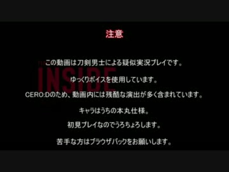 <span style="color: #373737;">鶴丸「あいでんてぃてぃー」</span><br> <span style="color: #0080ff;">一期「あいでんててー」</span><br> <br>こんにちは。<br>動画内では年末ネタ一切ありませんがよいお年を!<br><br>・一期さんと鶴丸さんがINSIDEをプレイする偽実況動画です。<br><span style="color: #ff0000;"><strong>・本動画内には残酷な演出が多々ありますのでご注意ください。</strong></span><br>・初見のため大変うろちょろしてます。<br><br>また視聴者の皆様が不快に思うようなコメントはお控えください。<br><br> 大丈夫な方は、ゆっくり各個撃破と洒落こんでいってね!<br>■追記■たくさんの宣伝ありがとうございます!<br>今回もお名前を書ききれなくなってしまったのでこちら( <a href="https://ch.nicovideo.jp/article/ar1165159" target="_blank" rel="noopener">ar1165159</a> )に書かせていただきました!ありがとうございました!<br><<a href="https://www.nicovideo.jp/watch/sm30297549" class="watch">sm30297549</a>|<a href="https://www.nicovideo.jp/series/99020" target="_blank" rel="noopener">series/99020</a>|<a href="https://www.nicovideo.jp/watch/sm30388956" class="watch">sm30388956</a>>