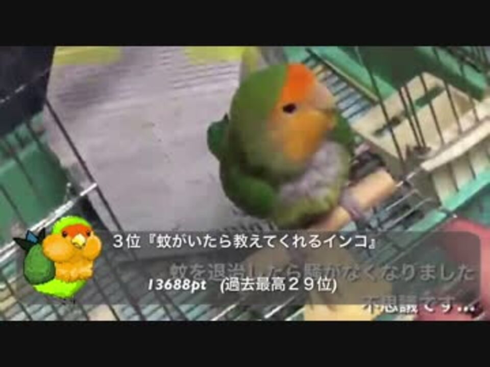 1年を振り返る親バカ動画です。最新のインコの様子もわかるよ!<br />年末から咳が止まらないので、何もやらないよりはと自己満で作りましたが、結構気合い入れて作ったので見てくれると嬉しいです!<br />マイリスト→<a href="https://www.nicovideo.jp/mylist/53480999" target="_blank" rel="noopener">mylist/53480999</a><br /><br />前の動画→<a href="https://www.nicovideo.jp/watch/sm30333862" class="watch">sm30333862</a><br />次の動画→<a href="https://www.nicovideo.jp/watch/sm30413247" class="watch">sm30413247</a><br /><br />BGM→dova_syndromeからお借りしました。<br /><br /><b>祝!ニコ動TOP掲載+話題入り+カテラン総合1位です♪ジャックやみなさんのおかげです。ありがとう</b><br /><br />ハイクオリティ版→<a href="https://youtu.be/xiCGKnVAJTk" target="_blank" rel="noopener nofollow">https://youtu.be/xiCGKnVAJTk</a><br />連絡先→twitter【@jacksan0506】<br />オカメのお宿さん、いつも広告とナイスなコメントありがとうございます!<br />ししがみさんも広告ありがとうございます!!<br />>>コメント アイコンのドット絵は自作です!慣れないのでどなたか作っていただきたいです´д` ;