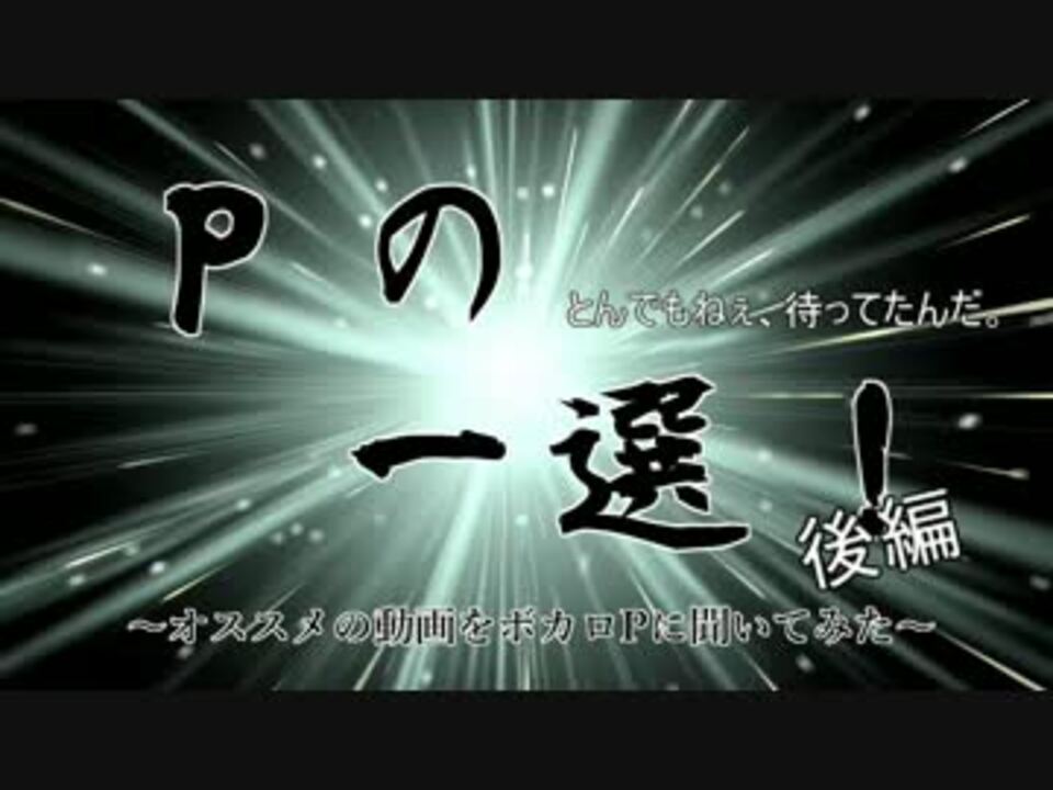 <font size=4><b>前編:<a href="https://www.nicovideo.jp/watch/sm30395393" class="watch">sm30395393</a></b></font><br />ボカロ界隈では、2016年も様々な名作が生まれました。<br /><br />ボカロP(VOCALOID、UTAU、Cevio等含む&動画師等含む)に、<br />2016年に投稿されたボカロ界隈の動画のうち、<br />あなたはどの動画を皆さん(視聴者)に1番おススメしたいと思いましたか?<br />と聞いてみた結果がこれです。<br /><br />ボカロPがおすすめする、1人1つの「一選」動画、ぜひご覧ください。<br />あなたの新しいお気に入り動画が見つかれば幸いです。<br /><br />企画の詳細:<b><a href="https://ch.nicovideo.jp/article/ar1146288" target="_blank" rel="noopener">ar1146288</a></b><br />Staff:<b><a href="https://ch.nicovideo.jp/article/ar1170258" target="_blank" rel="noopener">ar1170258</a></b><br /><br />生放送版:<b><a href="https://live.nicovideo.jp/watch/lv286589183" target="_blank" rel="noopener">lv286589183</a></b><br /><br />紹介動画・選者のマイリス:<b><a href="https://www.nicovideo.jp/mylist/57977458" target="_blank" rel="noopener">mylist/57977458</a></b><br /><br />2015年版:<b><a href="https://www.nicovideo.jp/watch/sm27988780" class="watch">sm27988780</a></b><br /><br />【訂正】あちゃそさんの推薦文最後2文字だけ文字切れしています。申し訳ございません。<br />