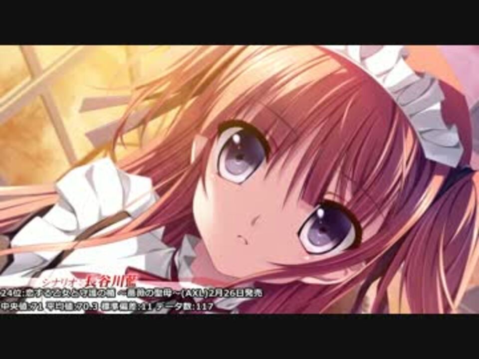 2016年発売のエロゲ作品の批評空間ランキングです。<br />※データ数100以上、同人・コンシューマ・非R18作品は除外。集計方法は動画内にて。<br />※1月11日集計ver<br />※完全版→<a href="https://www.nicovideo.jp/watch/sm30739393" class="watch">sm30739393</a>(データ数70以上)<br /><br />批評空間ランキング<br />過去にアップした批評空間ランキング→<a href="https://www.nicovideo.jp/mylist/56022720" target="_blank" rel="noopener">mylist/56022720</a><br />批評空間以外のエロゲランキング→<a href="https://www.nicovideo.jp/mylist/56022947" target="_blank" rel="noopener">mylist/56022947</a><br /><br /><b>【訂正】</b><br />一部作品の数値に誤りがありました。修正は投稿者コメントで行っております。<br /><br />データ数50以上版→<a href="https://www.nicovideo.jp/watch/sm30473187" class="watch">sm30473187</a>