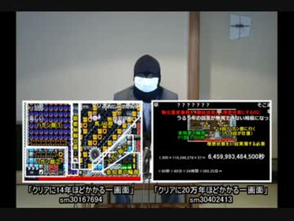 これまでにマリオメーカー学会にて発表してきた「クリアに14年ほどかかる一画面」(<a href="https://www.nicovideo.jp/watch/sm30167694" class="watch">sm30167694</a>)「クリアに20万年ほどかかる一画面」(<a href="https://www.nicovideo.jp/watch/sm30402413" class="watch">sm30402413</a>)に関して、いくつかお詫びしたい点がございまして、緊急記者会見を開催いたしました。大変お恥ずかしい内容ですが、ご容赦いただけましたら幸いです。<br /><br />信用の回復に向けて研究を進めて参りますので、今後ともどうぞ宜しくお願いいたします。<br /><br />2017.1.15 つめきすと