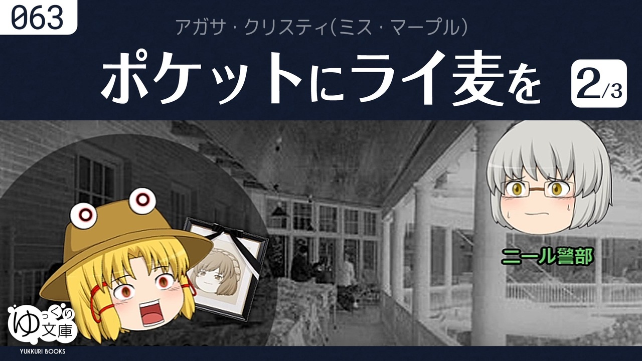 <span style="color: red;"><strong>063 マープル、ほぐす──</strong></span><br>犯人は屋敷の中にいる。ミス・マープルは複雑にからまった糸を解きほぐし、核心に迫っていく。<br><span style="color: green;">A Pocket Full of Rye (1953) by Agatha Christie</span><br><br>(うp主より)前後編の予定でしたが、後編を2つに分割しました。<br>編集後記:<a href="http://trynext.com/story/ybook/yb063.php" target="_blank" rel="noopener nofollow">http://trynext.com/story/ybook/yb063.php</a><br><br>●ゆっクリスティ <a href="https://www.nicovideo.jp/mylist/59497715" target="_blank" rel="noopener">mylist/59497715</a><br>◆ミス・マープル<br><a href="https://www.nicovideo.jp/watch/sm24238713" class="watch">sm24238713</a> 完璧なメイド<br><a href="https://www.nicovideo.jp/watch/sm25512772" class="watch">sm25512772</a> 動機と機会<br><a href="https://www.nicovideo.jp/watch/sm26942176" class="watch">sm26942176</a> 青いゼラニウム<br><a href="https://www.nicovideo.jp/watch/sm30507320" class="watch">sm30507320</a> <span style="color: #ff00ff;"><strong>ポケットにライ麦を (全3話)</strong></span><br><a href="https://www.nicovideo.jp/watch/sm32946182" class="watch">sm32946182</a> パディントン発4時50分(On Going)<br><a href="https://www.nicovideo.jp/watch/sm38609548" class="watch">sm38609548</a> # 原作に近い版<br><a href="https://www.nicovideo.jp/watch/sm33091342" class="watch">sm33091342</a> 鏡は横にひび割れて<br><a href="https://www.nicovideo.jp/watch/sm37048244" class="watch">sm37048244</a> 予告殺人 (全4話)<br><a href="https://www.nicovideo.jp/watch/sm37202036" class="watch">sm37202036</a> #z ドラ・バンナーは間違っていたか?<br><br>◆ポワロ<br><a href="https://www.nicovideo.jp/watch/sm25458371" class="watch">sm25458371</a> スズメバチの巣<br><a href="https://www.nicovideo.jp/watch/sm38918082" class="watch">sm38918082</a> オリエント急行の殺人(On Going)<br><a href="https://www.nicovideo.jp/watch/sm39365170" class="watch">sm39365170</a> ナイルに死す (全3話)<br><a href="https://www.nicovideo.jp/watch/sm40164143" class="watch">sm40164143</a> 消えた遺言書<br><br>◆ほか<br><a href="https://www.nicovideo.jp/watch/sm33975066" class="watch">sm33975066</a> そして誰もいなくなった #1<br><a href="https://www.nicovideo.jp/watch/sm33981315" class="watch">sm33981315</a> #2<br><a href="https://www.nicovideo.jp/watch/sm33986818" class="watch">sm33986818</a> #pv 松谷祐子「愛はブーメラン」<br><br>---<br>ゆっくり文庫:全部<br><a href="https://www.nicovideo.jp/mylist/74874627" target="_blank" rel="noopener">mylist/74874627</a><br>ゆっくり文庫:近況<br><a href="https://twitter.com/trynext" target="_blank" rel="noopener nofollow">https://twitter.com/trynext</a><br>---<br><br>◆ポケットにライ麦を<br><a href="https://www.nicovideo.jp/watch/sm30507320" class="watch">sm30507320</a> #1 マープル、怒る<br><a href="https://www.nicovideo.jp/watch/sm30511824" class="watch">sm30511824</a> #2 マープル、ほぐす<br><a href="https://www.nicovideo.jp/watch/sm30512247" class="watch">sm30512247</a> #3 マープル、泣く<br><br>