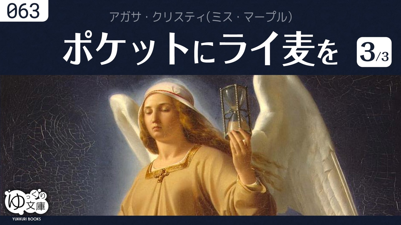 <span style="color: red;"><strong>063c マープル、泣く──</strong></span><br>犯人はわかった。手口も動機も明らか。しかし逮捕できない。《探偵》マープルの敗北だった。<br><span style="color: green;">A Pocket Full of Rye (1953) by Agatha Christie</span><br><br>●ゆっクリスティ <a href="https://www.nicovideo.jp/mylist/59497715" target="_blank" rel="noopener">mylist/59497715</a><br>◆ミス・マープル<br><a href="https://www.nicovideo.jp/watch/sm24238713" class="watch">sm24238713</a> 完璧なメイド<br><a href="https://www.nicovideo.jp/watch/sm25512772" class="watch">sm25512772</a> 動機と機会<br><a href="https://www.nicovideo.jp/watch/sm26942176" class="watch">sm26942176</a> 青いゼラニウム<br><a href="https://www.nicovideo.jp/watch/sm30507320" class="watch">sm30507320</a> <span style="color: #ff00ff;"><strong>ポケットにライ麦を (全3話)</strong></span><br><a href="https://www.nicovideo.jp/watch/sm32946182" class="watch">sm32946182</a> パディントン発4時50分(On Going)<br><a href="https://www.nicovideo.jp/watch/sm38609548" class="watch">sm38609548</a> # 原作に近い版<br><a href="https://www.nicovideo.jp/watch/sm33091342" class="watch">sm33091342</a> 鏡は横にひび割れて<br><a href="https://www.nicovideo.jp/watch/sm37048244" class="watch">sm37048244</a> 予告殺人 (全4話)<br><a href="https://www.nicovideo.jp/watch/sm37202036" class="watch">sm37202036</a> #z ドラ・バンナーは間違っていたか?<br><br>◆ポワロ<br><a href="https://www.nicovideo.jp/watch/sm25458371" class="watch">sm25458371</a> スズメバチの巣<br><a href="https://www.nicovideo.jp/watch/sm38918082" class="watch">sm38918082</a> オリエント急行の殺人(On Going)<br><a href="https://www.nicovideo.jp/watch/sm39365170" class="watch">sm39365170</a> ナイルに死す (全3話)<br><a href="https://www.nicovideo.jp/watch/sm40164143" class="watch">sm40164143</a> 消えた遺言書<br><br>◆ほか<br><a href="https://www.nicovideo.jp/watch/sm33975066" class="watch">sm33975066</a> そして誰もいなくなった #1<br><a href="https://www.nicovideo.jp/watch/sm33981315" class="watch">sm33981315</a> #2<br><a href="https://www.nicovideo.jp/watch/sm33986818" class="watch">sm33986818</a> #pv 松谷祐子「愛はブーメラン」<br><br>---<br>ゆっくり文庫:全部<br><a href="https://www.nicovideo.jp/mylist/74874627" target="_blank" rel="noopener">mylist/74874627</a><br>ゆっくり文庫:近況<br><a href="https://twitter.com/trynext" target="_blank" rel="noopener nofollow">https://twitter.com/trynext</a><br>---<br><br>◆ポケットにライ麦を<br><a href="https://www.nicovideo.jp/watch/sm30507320" class="watch">sm30507320</a> #1 マープル、怒る<br><a href="https://www.nicovideo.jp/watch/sm30511824" class="watch">sm30511824</a> #2 マープル、ほぐす<br><a href="https://www.nicovideo.jp/watch/sm30512247" class="watch">sm30512247</a> #3 マープル、泣く<br><br>