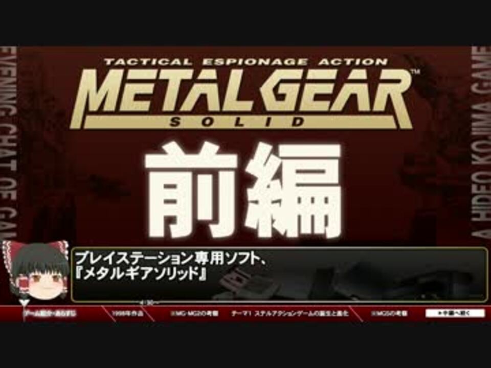 毎回ひとつのゲームを取り上げ、3つのテーマから解説&考察します。<br />前編では、MSX2専用ソフトMG・MG2ソリッドスネークにも触れています。<br /><br /><b><font color="red">■「MGS」中編はこちら <a href="https://www.nicovideo.jp/watch/sm30549596" class="watch">sm30549596</a></font></b><br /><b><font color="red">■「MGS」後編はこちら <a href="https://www.nicovideo.jp/watch/sm30561480" class="watch">sm30561480</a></font></b><br /><br />■youtube高画質版はこちら <a href="https://youtu.be/hBSz4MaxV7I" target="_blank" rel="noopener nofollow">https://youtu.be/hBSz4MaxV7I</a><br />■告知用のツイッター始めました <a href="https://twitter.com/@gameyawa" target="_blank" rel="noopener nofollow">https://twitter.com/@gameyawa</a><br /><br />■第5回「FFⅨ」<a href="https://www.nicovideo.jp/watch/sm30319066" class="watch">sm30319066</a>(前編)<a href="https://www.nicovideo.jp/watch/sm30320510" class="watch">sm30320510</a>(後編)<br />■第7回「バイオハザード」<a href="https://www.nicovideo.jp/watch/sm30737355" class="watch">sm30737355</a>(前編)<a href="https://www.nicovideo.jp/watch/sm30745753" class="watch">sm30745753</a>(後編)■ゲーム夜話マイリスト <a href="https://www.nicovideo.jp/mylist/56973971" target="_blank" rel="noopener">mylist/56973971</a><br />