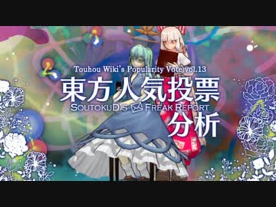<font size=5>投稿が遅れまして深くお詫び申し上げます。</font><br /><br /><b>第12回東方Project人気投票</b>から<b>第13回東方Project人気投票にかけて</b>の人気の変動をランキングにしたいつもの動画です。<br />なお、この動画は、「第12回東方Project人気投票(理論編)」(<a href="https://www.nicovideo.jp/watch/sm28103825" class="watch">sm28103825</a>)で計算された式を元に、「第12回人気投票から今回へかけてのキャラクターの人気変動」を数字で表したものになっています。<br />強制エンコードが思ったよりヒドいので、推奨画面サイズは「中」です。<br />過去の人気投票分析 <a href="https://www.nicovideo.jp/mylist/50434345" target="_blank" rel="noopener">mylist/50434345</a><br /><br />おしながき<br /><a href="#" class="seekTime" data-seekTime="3:46" onclick="seekNicoPlayer('#3:46'); return false;">#3:46</a> 新曲等の人気<br /><a href="#" class="seekTime" data-seekTime="7:21" onclick="seekNicoPlayer('#7:21'); return false;">#7:21</a> 音楽部門<br /><a href="#" class="seekTime" data-seekTime="13:13" onclick="seekNicoPlayer('#13:13'); return false;">#13:13</a> 人妖部門一般得票<br /><a href="#" class="seekTime" data-seekTime="19:16" onclick="seekNicoPlayer('#19:16'); return false;">#19:16</a> 人妖部門イチオシ<br /><a href="#" class="seekTime" data-seekTime="24:45" onclick="seekNicoPlayer('#24:45'); return false;">#24:45</a> ベストパートナー<br /><a href="#" class="seekTime" data-seekTime="29:42" onclick="seekNicoPlayer('#29:42'); return false;">#29:42</a> まとめ<br /><a href="#" class="seekTime" data-seekTime="34:56" onclick="seekNicoPlayer('#34:56'); return false;">#34:56</a> 第九<br /><br /><b>第14回できました <a href="https://www.nicovideo.jp/watch/sm32722377" class="watch">sm32722377</a></b>