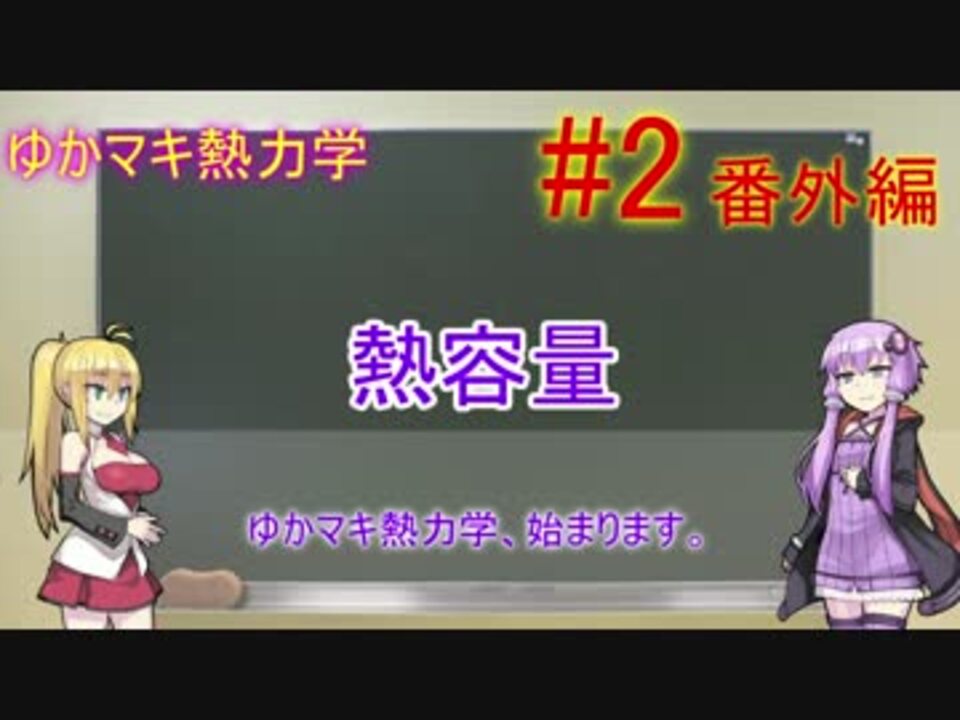 前回【<a href="https://www.nicovideo.jp/watch/sm30792500" class="watch">sm30792500</a>】次回【未定】<br />マイリスト【<a href="https://www.nicovideo.jp/mylist/58562581" target="_blank" rel="noopener">mylist/58562581</a>】<br /><br />大学1年生で学ぶ「基礎熱力学」を紹介していく【ゆかマキ熱力学】シリーズ第二回目動画の番外編。<br /><br />Tonaeさん、トシローさん、べんぜんさん、墨色さん,影02さん宣伝本当にありがとうごさいます!!<br /><br />トシローさんの「サウナで強い風にあたってみよう」[宣伝参照]という意見はもっともなことです。簡単のためとはいえ、サウナ・湯船ともに熱供給は考えない少し不自然なモデルになってしましました。そのことを動画内に断っておくべきだったと思います。<br /><br />また、定圧熱容量>定容熱容量が成り立つのは、同じ物質量を仮定している時に限ります。そのことをうっかりしていました。