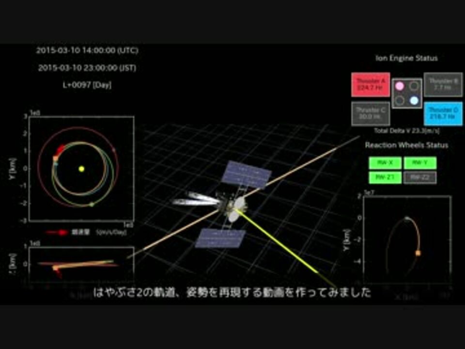 JAXA、NASAで公開されているデータをもとに、はやぶさ2の打ち上げから地球スウィングバイまでの軌道・姿勢ををCGで再現してみました。また、リアクションホイール温存のためのソーラーセイルモードに関する簡単な解説を行いました。<br><br>エンコード品質調整のため、前編、後編に分けています<br>この動画は前編で、内容は、打ち上げから初期性能確認の様子、ソーラーセイルモードの解説です。<br>後編:<a href="https://www.nicovideo.jp/watch/sm30962083" class="watch">sm30962083</a><br><br>youtube版→<a href="https://www.youtube.com/edit?o=U&video_id=nV9upGVEqFE" target="_blank" rel="noopener nofollow">https://www.youtube.com/edit?o=U&video_id=nV9upGVEqFE</a><br>これまで投稿したもの 宇宙関係→<a href="https://www.nicovideo.jp/mylist/4695839" target="_blank" rel="noopener">mylist/4695839</a>、その他→<a href="https://www.nicovideo.jp/mylist/17381515" target="_blank" rel="noopener">mylist/17381515</a><br>あまずさ様、はやぶさ2様、鍵山雛様、やまごん様、天津様、メハリ様、しーた様 、yoga_fire様、通りすがり様、無限様、yuzue様、よっち様、マルバス様、リンク様 広告ありがとうございます