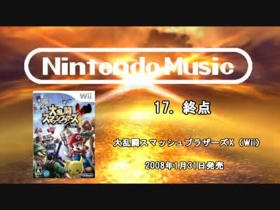 <i><font color="red"> 自動で次の動画にジャンプします。長時間作業にも使ってやってくださいませ</font></i><br /><br />スマブラシリーズの「終点」の曲は全シリーズ好きですが、個人的にはスマブラXのが一番アツくなります。<br />全リスト【<a href="https://www.nicovideo.jp/mylist/22839126" target="_blank" rel="noopener">mylist/22839126</a>】vol.1【<a href="https://www.nicovideo.jp/watch/sm11387382" class="watch">sm11387382</a>】<br /><i><font size="1" color="darkblue">収録ソフト:スーパーマリオワールド 64 星のカービィ64 Wii ポケットモンスターサン・ムーン 赤・緑 ポケモンコロシアム 大乱闘スマッシュブラザーズX WiiU ファイアーエムブレム 新・紋章の謎 スターフォックスゼロ F-ZERO GX 巨人のドシン1 くるくるくるりん スペースバズーカ ゼノブレイドクロス</font></i>