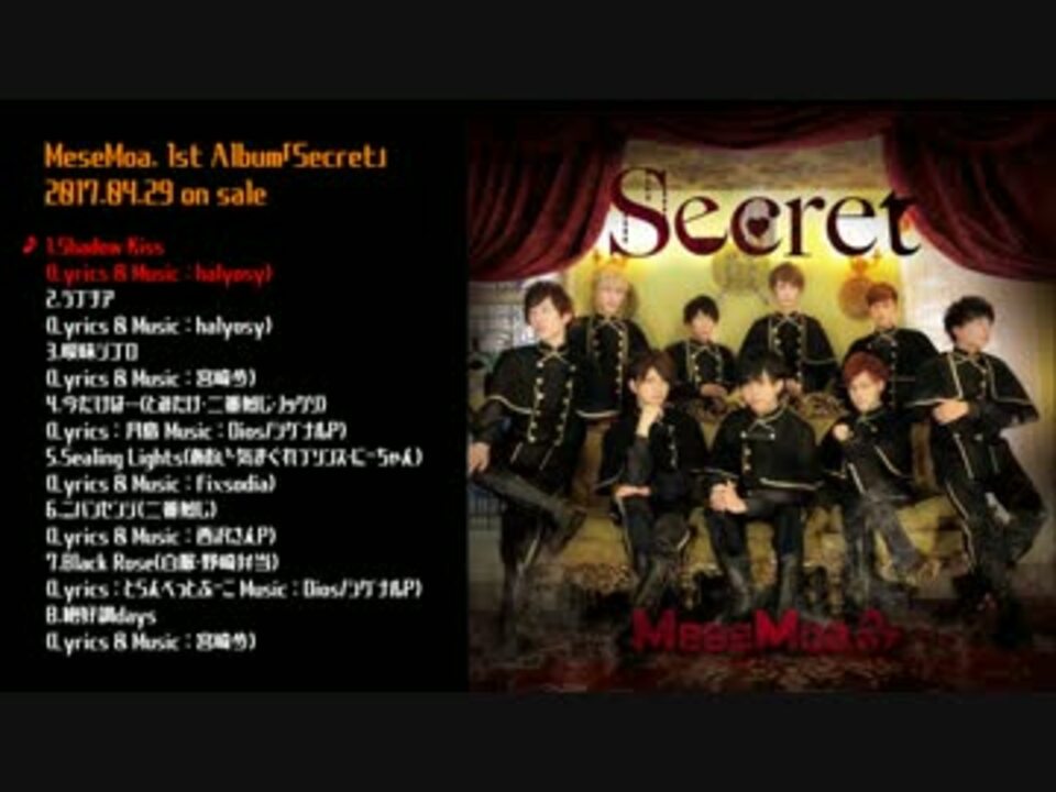MeseMoa.改名後、初となるアルバム<br />「Secret」が2017年4月29日(土)発売!<br /><br />【CD】<br />1.Shadow Kiss<br />Lyrics & Music : halyosy<br />2.ラブチア<br />Lyrics & Music : halyosy<br />3.曖昧ジゴロ<br />Lyrics & Music : 宮崎歩<br />4.今だけは…(とみたけ・二番煎じ・ノックソ)<br />Lyrics : 月島 Music : Dios/シグナルP<br />5.Sealing Lights(あおい・気まぐれプリンス・にーちゃん)<br />Lyrics & Music : fixsodia<br />6.ニバンセンジ<br />Lyrics & Music : 西沢さんP<br />7.Black Rose(白服・野崎弁当)<br />Lyrics : とらんぺっとぷーこ Music : Dios/シグナルP<br />8.絶好調days<br />Lyrics & Music : 宮崎歩<br /><br />【DVD】<br />Aタイプ「Kiss」には「Shadow Kiss」のMV・メイキングが、<br />Bタイプ「チア」には「ラブチア」のMV・メイキングが収録!<br /><br />■公式HP<br /><a href="http://www.mesemoa.com" target="_blank" rel="noopener nofollow">http://www.mesemoa.com</a><br />■公式SHOP<br /><a href="http://musumen.shop-pro.jp/" target="_blank" rel="noopener nofollow">http://musumen.shop-pro.jp/</a>