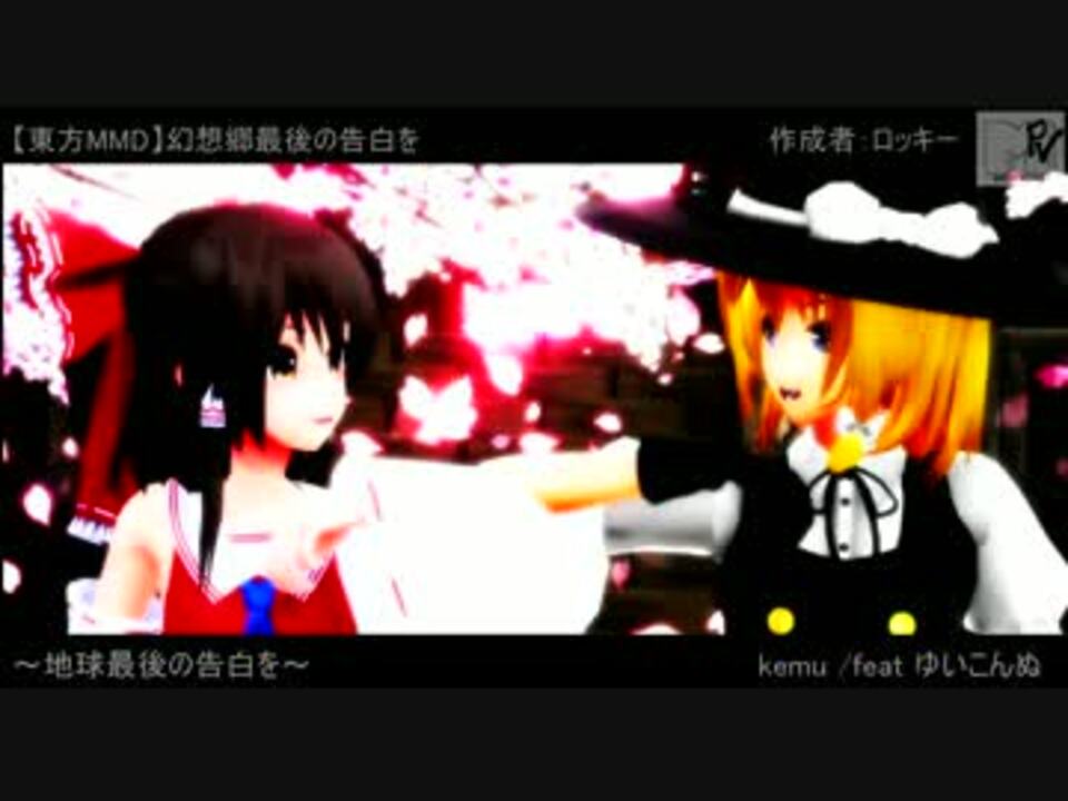 大げさなタイトルですが「地球最後の告白を」の流し込みです!!<br />タイトル詐欺とか言わないでヽ(・∀・)ノ<br /><br />ニコ童祭の動画作成中に息抜きに流し込みを作ろうと思い前回のように三日で終わるかなぁと思ったらサブキャラ出したくなって二週間程かかってしまいました・・・<br /><br />この曲は前回のMMD杯にて知ったのですがもう三、四年前の曲なんですね・・・(汗)<br /><br />いつものレイマリみょんさくな動画ですがよろしくお願いします。<br /><br /><br />いままで作ったもの <a href="https://www.nicovideo.jp/mylist/55657409" target="_blank" rel="noopener">mylist/55657409</a><br /><br />ツイッター <a href="https://twitter.com/g71Jpps7mgqsdM1" target="_blank" rel="noopener nofollow">https://twitter.com/g71Jpps7mgqsdM1</a><br /><br />ようつべ(高画質?) <a href="https://www.youtube.com/channel/UChlh6088kajCHylxfw-6C-Q" target="_blank" rel="noopener nofollow">https://www.youtube.com/channel/UChlh6088kajCHylxfw-6C-Q</a><br /><br /><br />追記 クレジットにもちたぬき様のアクセサリ「スペルカード」がぬけてました!!すいませんTT